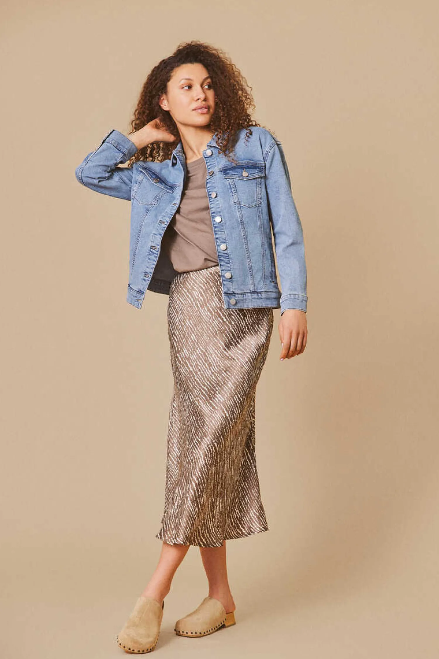 Saia Acetinada. Comprimento Midi E Corte Evase Com Folho Em Baixo. Cintura Subida E Com Elastico. Combina Com A Blusa Acetinada De Vila.