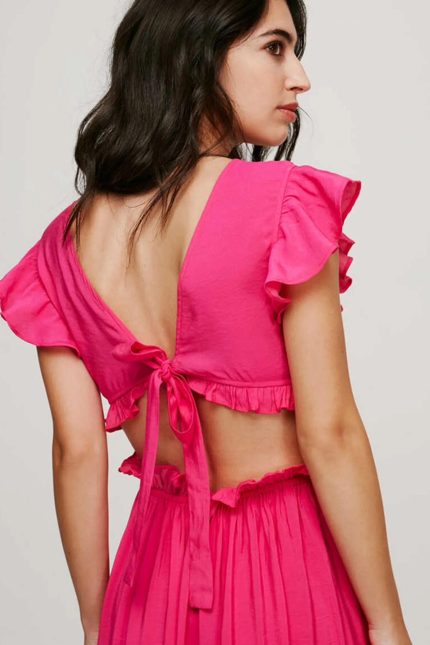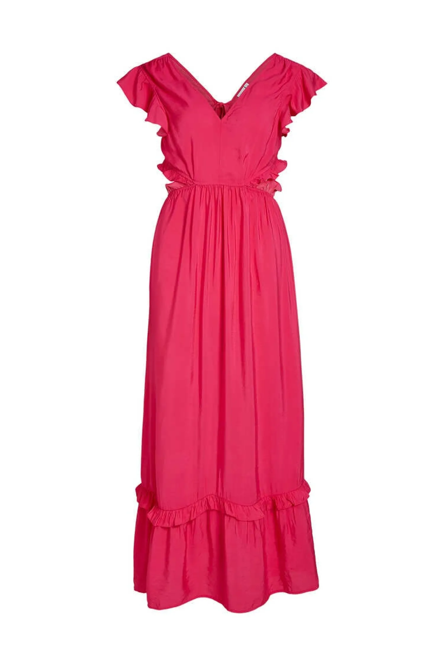 Vestido Comprido De Alcas. Decote Em Bico Na Frente. Costas Abertas Fechadas Com Lacada. Folhos Na Manga E Bainha.