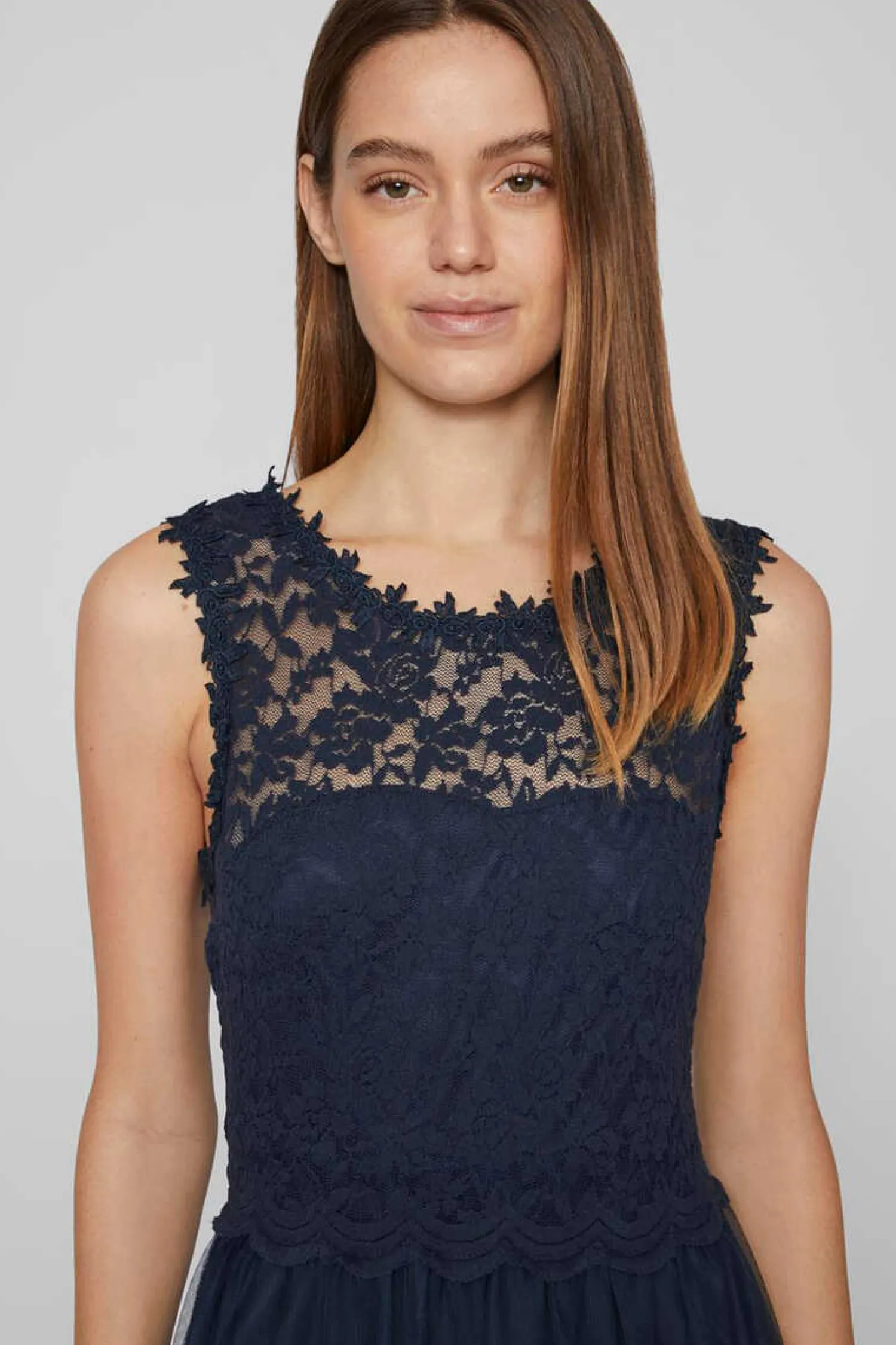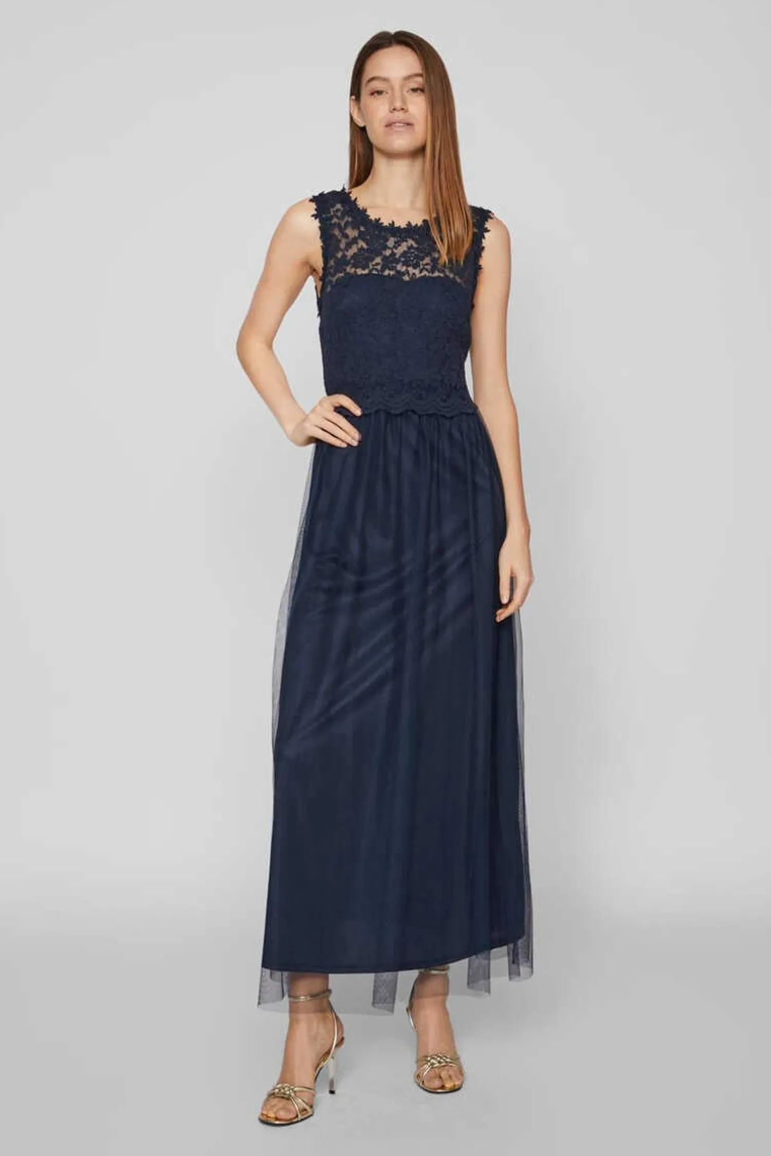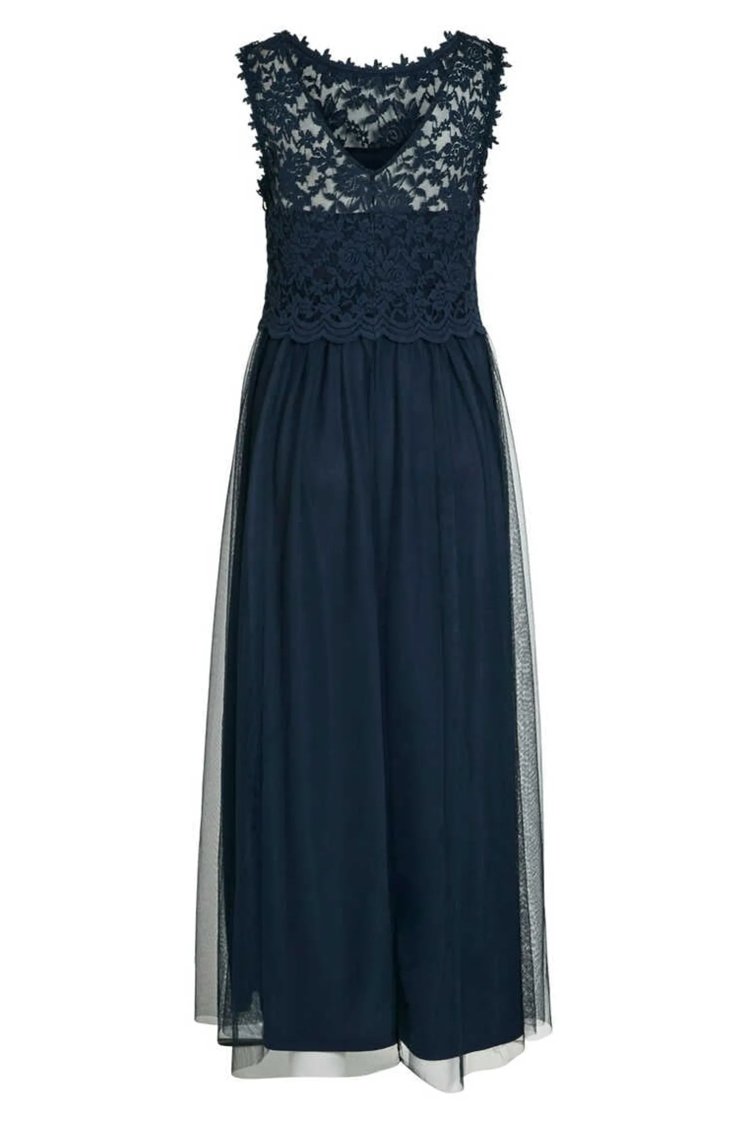 Vestido Comprido.Corpo Sem Mangas, Decote Redondo E Pormenor De Renda. Saia De Tule Com Roda.