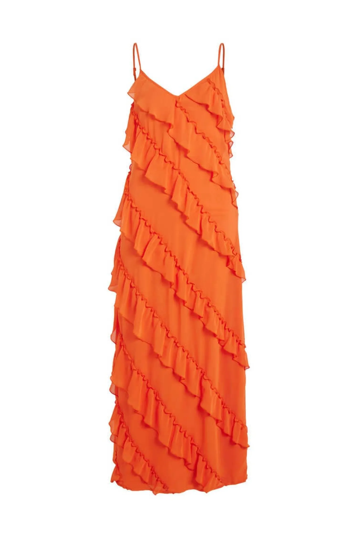 Vestido Comprido De Alcas Com Detalhe De Folhos. Decote Acabamento Em Bico. Alcas Ajustaveis.