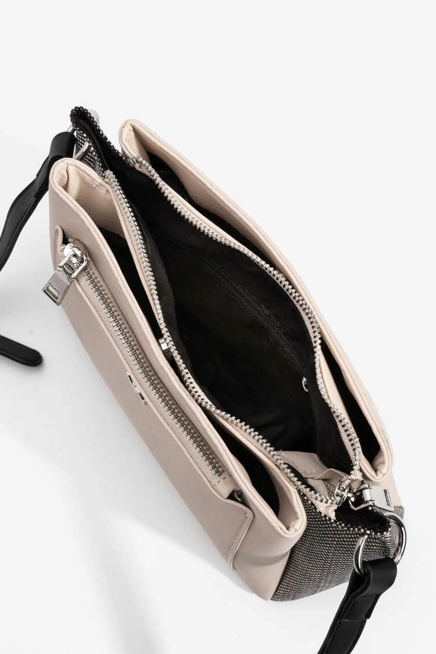 Mala De Tiracolo Combinada Com Alca Regulavel E Tres Compartimentos Superiores, Um Deles Com Fecho De Correr.