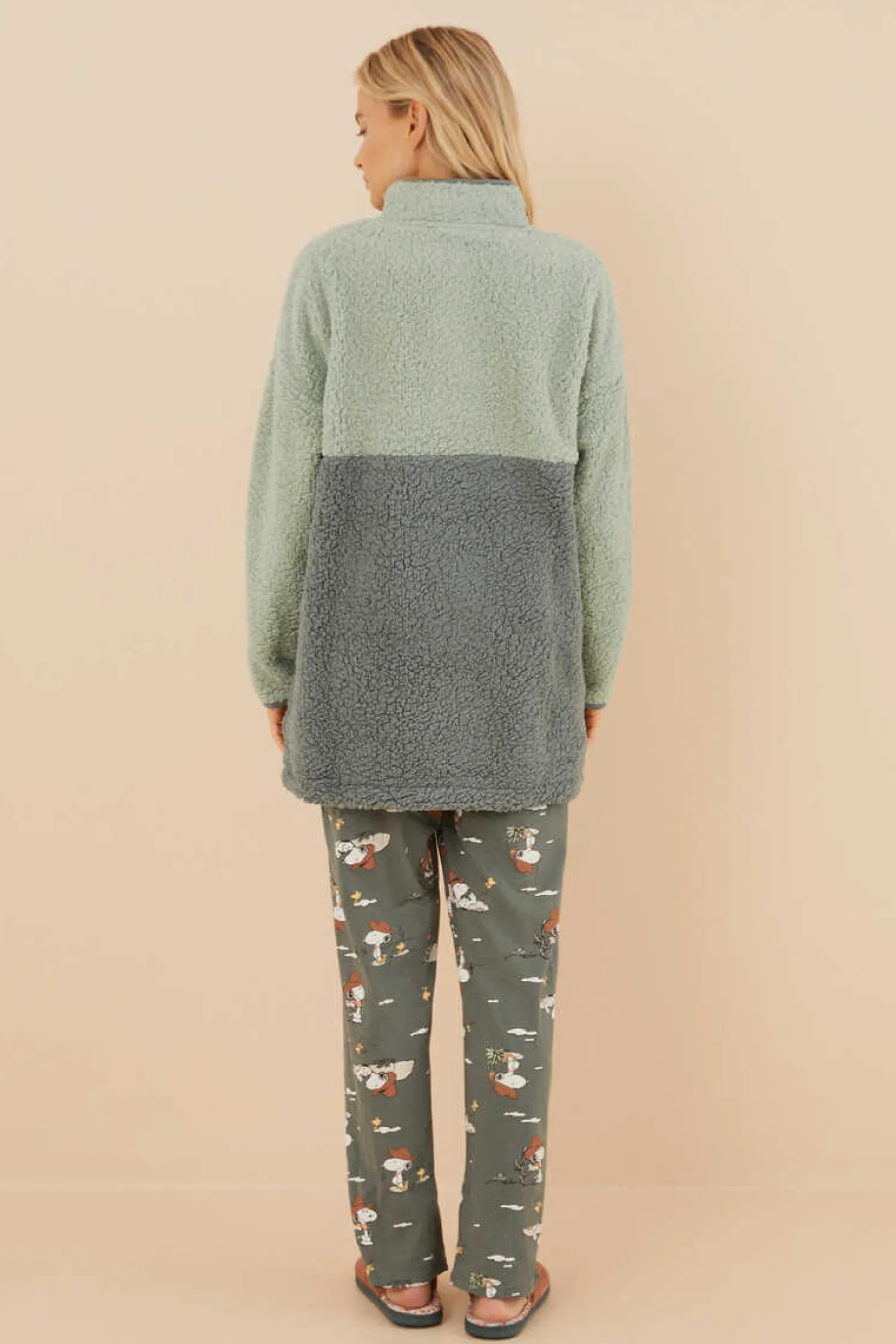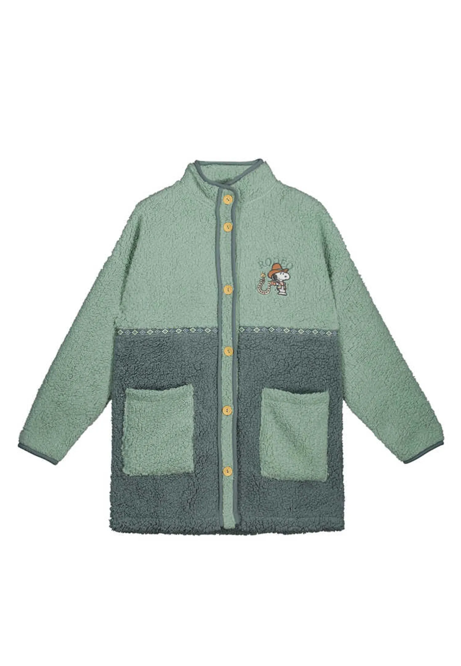 Robe Curto Em Verde, Com Detalhe Do Snoopy, Em Tecido Suave De Borrego, Superconfortavel E Quente. Gola Media Fechada Com Botoes De Madeira, Debruns Em Contrast … E E Bolsos De Patch Com Peca De Rebordo Etnica. Ideal Para Nao Passar Frio Nenhum.