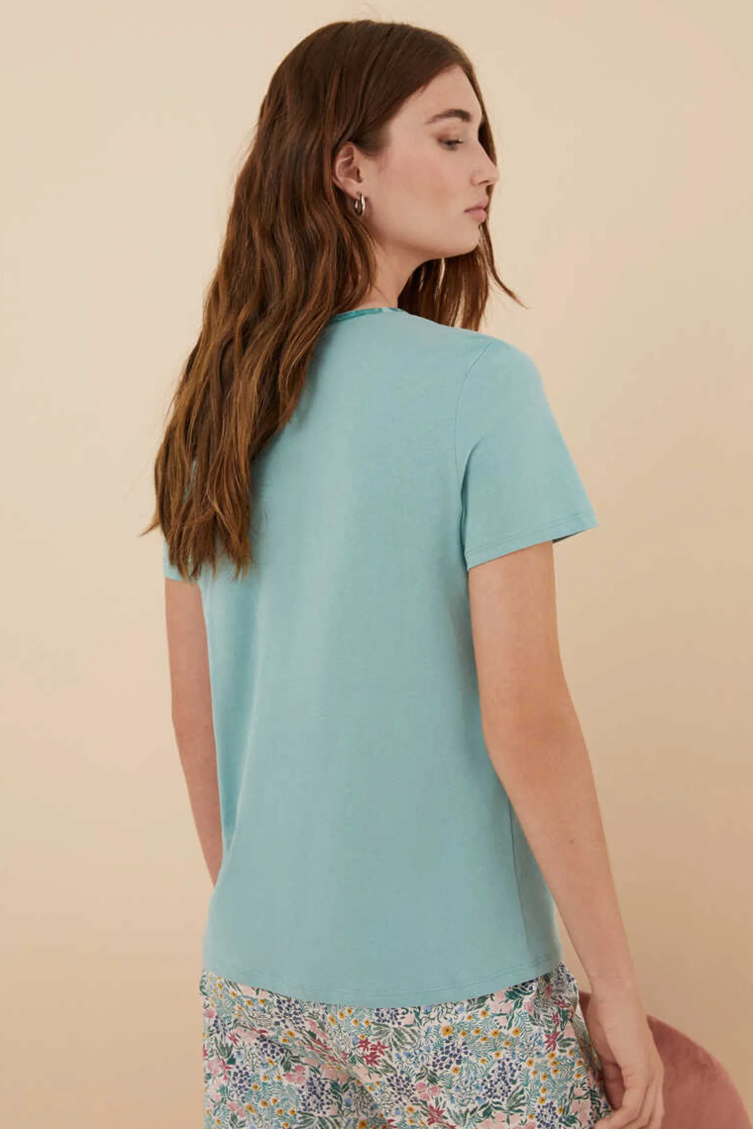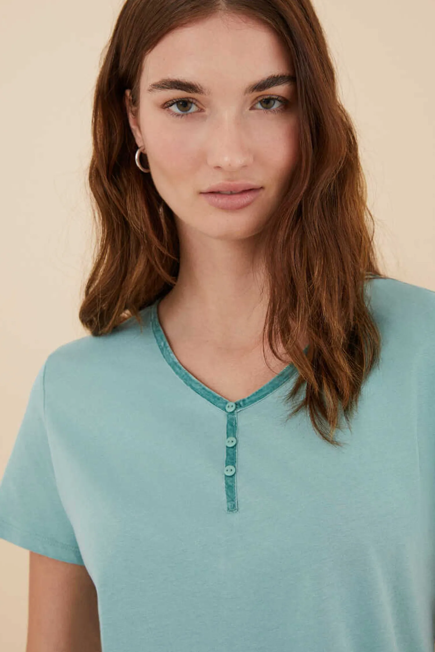 T-Shirt 100% Algodao De Manga Curta, Em Verde, Com Decote Em Bico, Detalhe De Carcela Em Veludo No Tom E Botoes De Nacar. Ombro Caido E Estampado Na Parte Inter … Ior Das Costas. Combina Com Varias Calcas Diferentes, Escolhe O Teu Favorito E Personaliza O Teu Proprio Pijama.