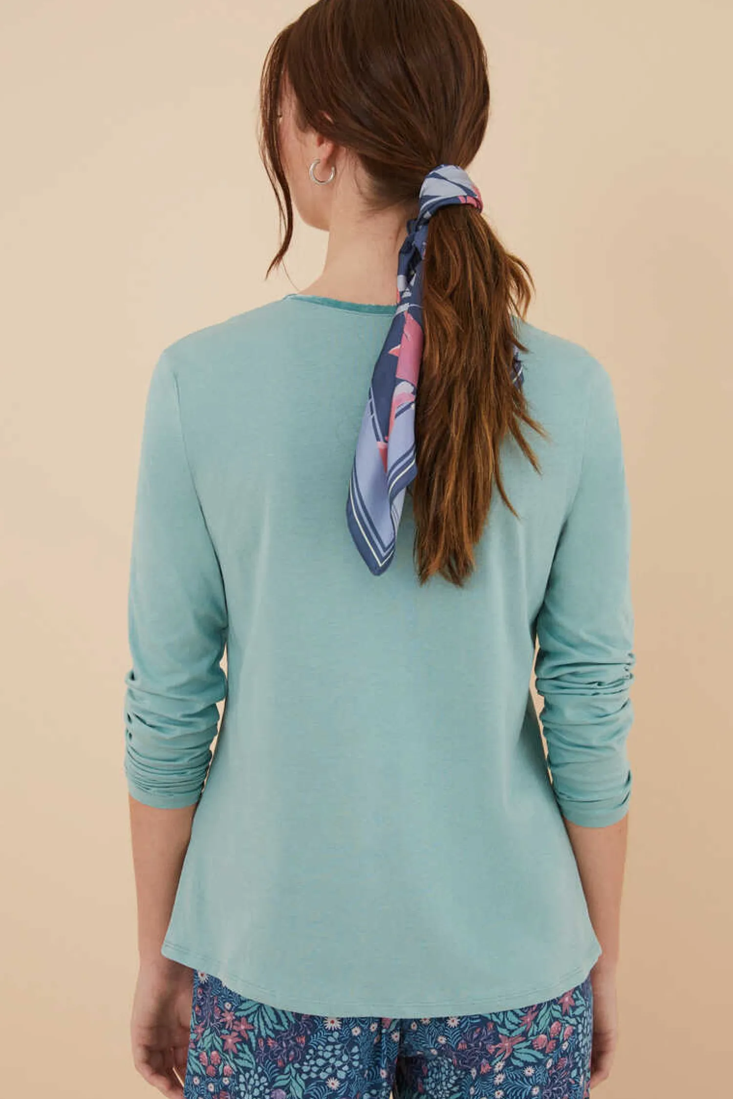 T-Shirt 100% Algodao De Manga Comprida, Em Verde, Com Decote Em Bico, Detalhe De Carcela Em Veludo No Tom E Botoes De Nacar. Ombro Caido E Estampado Na Parte In … Terior Das Costas. Combina Com Varias Calcas Diferentes, Escolhe O Teu Favorito E Personaliza O Teu Proprio Pijama.