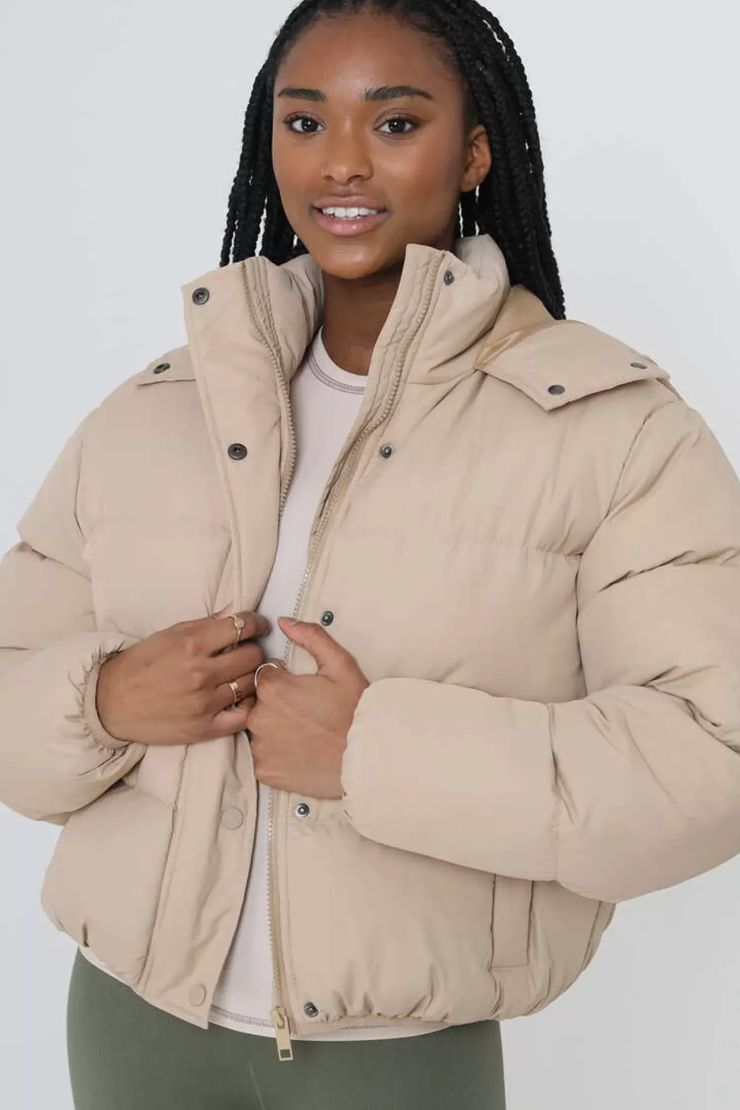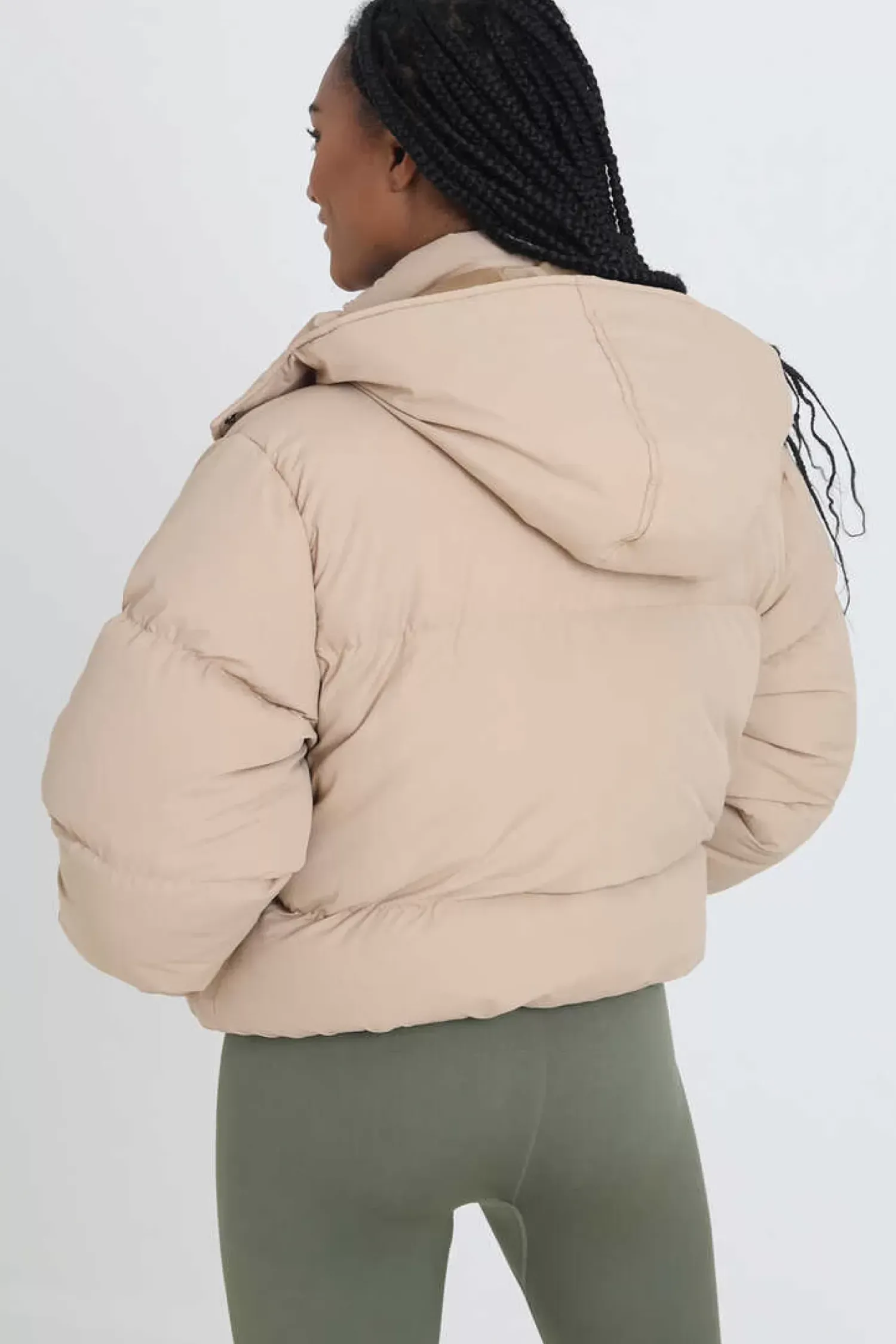 Casaco De Penas De Mulher Acolchoado, Curto, Oversize, Com Capuz E Bolsos. Fecho Mediante Fecho-Eclair E Botoes De Pressao