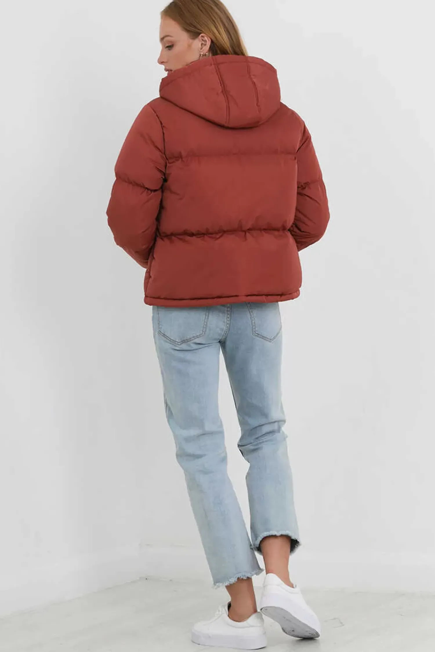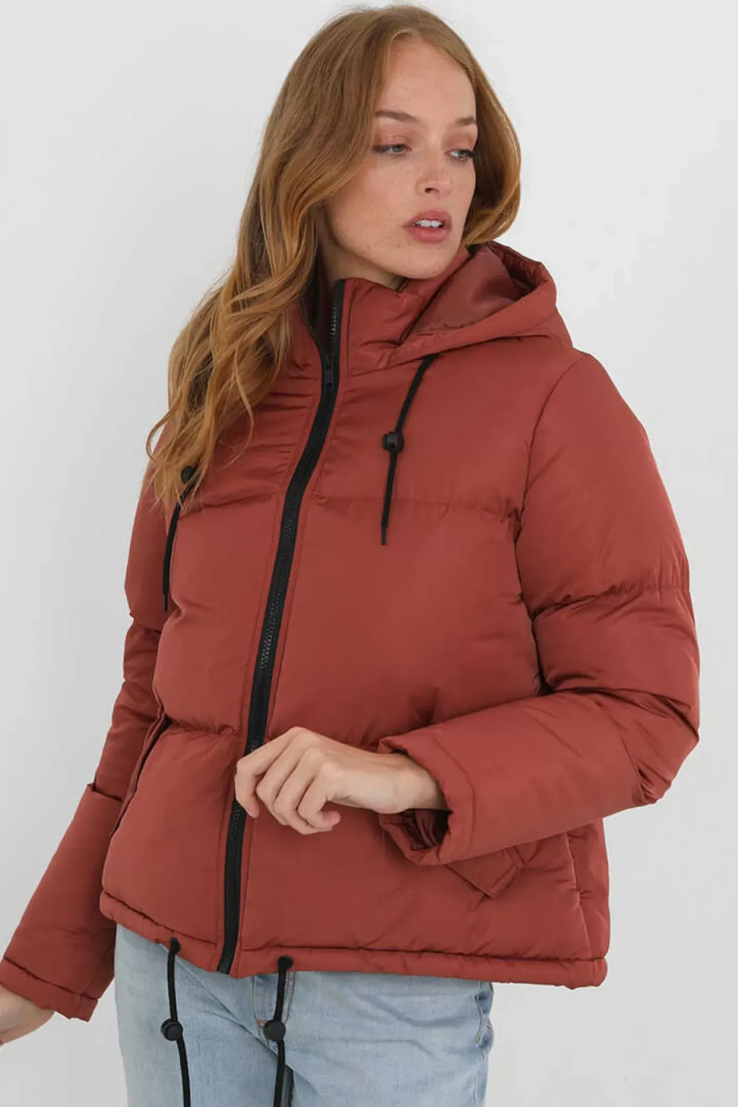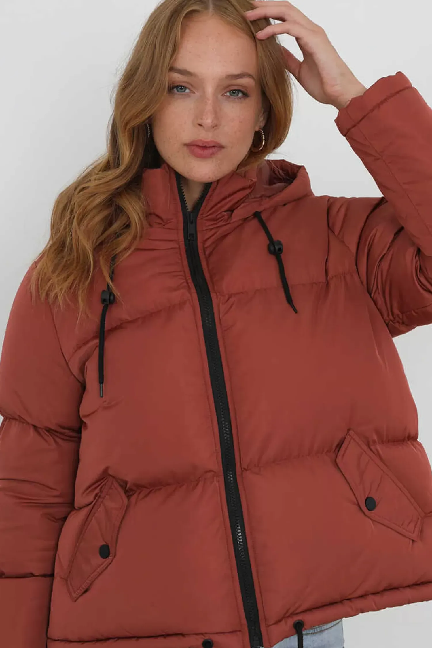 Casaco De Penas De Mulher, Acolchoado E Capuz. Fecho Mediante Fecho-Eclair E Botoes De Pressao. Com Dois Bolsos, Cordoes Ajustaveis No Capuz E Na Bainha