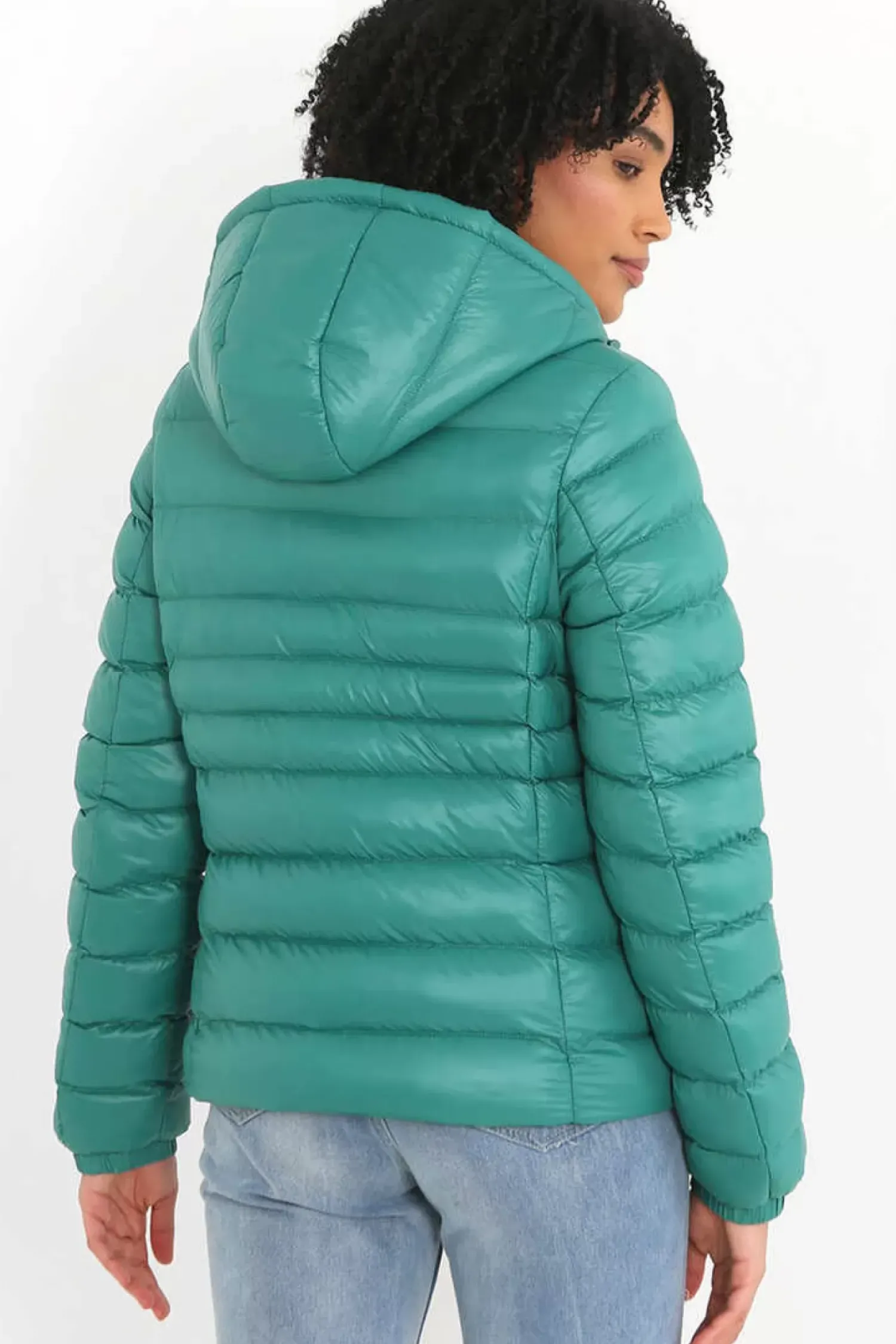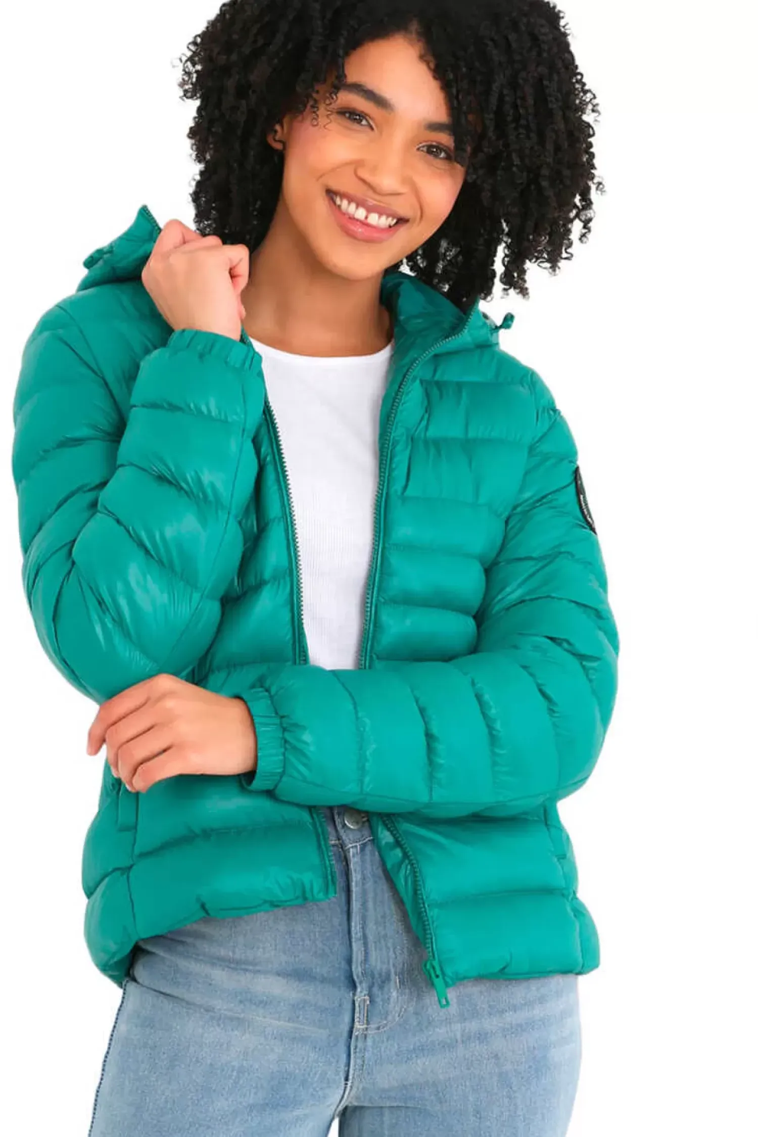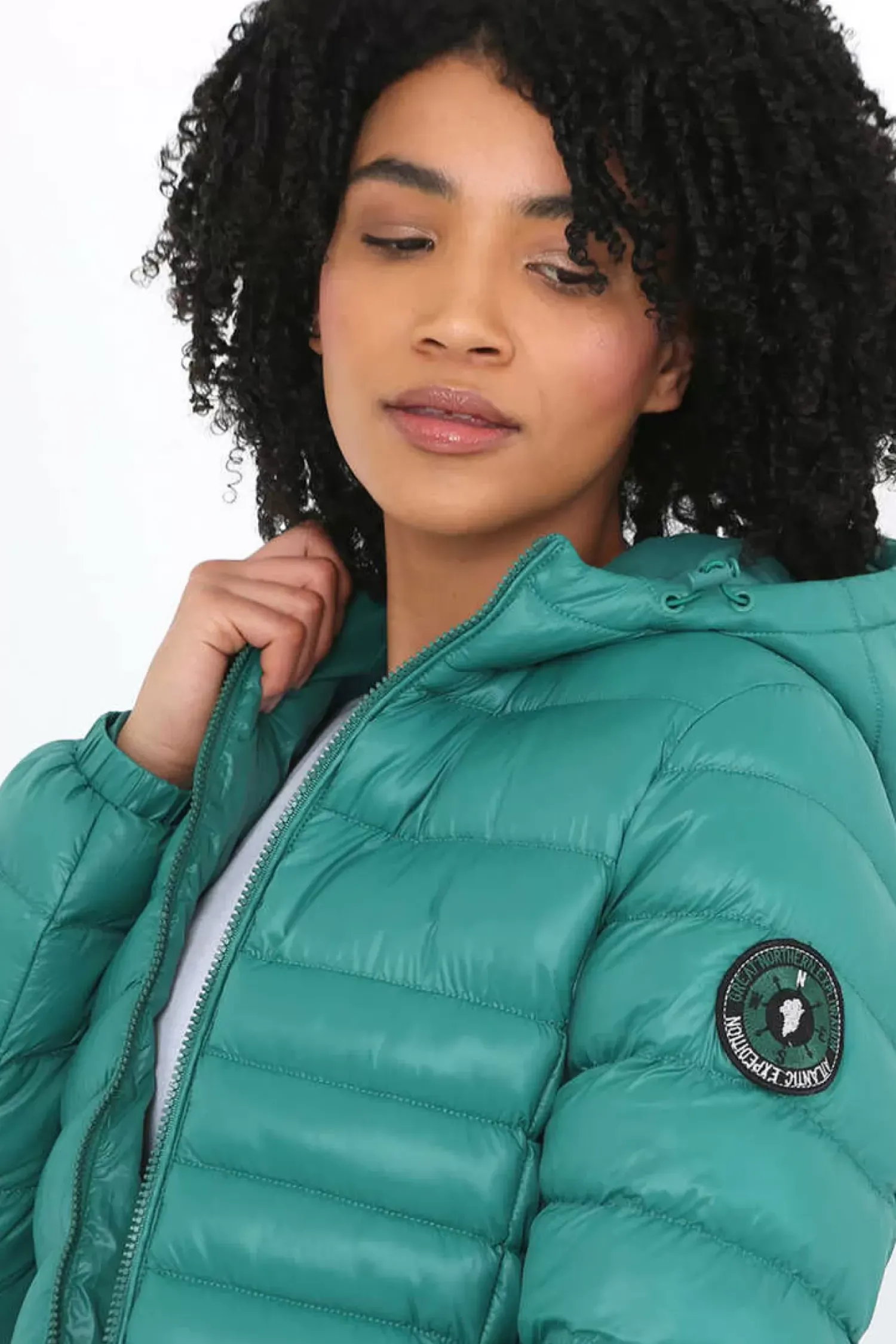 Casaco De Penas De Mulher, Acolchoado, Com Capuz E Remendo Bordado Na Manga. Fechamento Mediante Fecho-Eclair Com Dois Bolsos. Cordoes Ajustaveis No Capuz