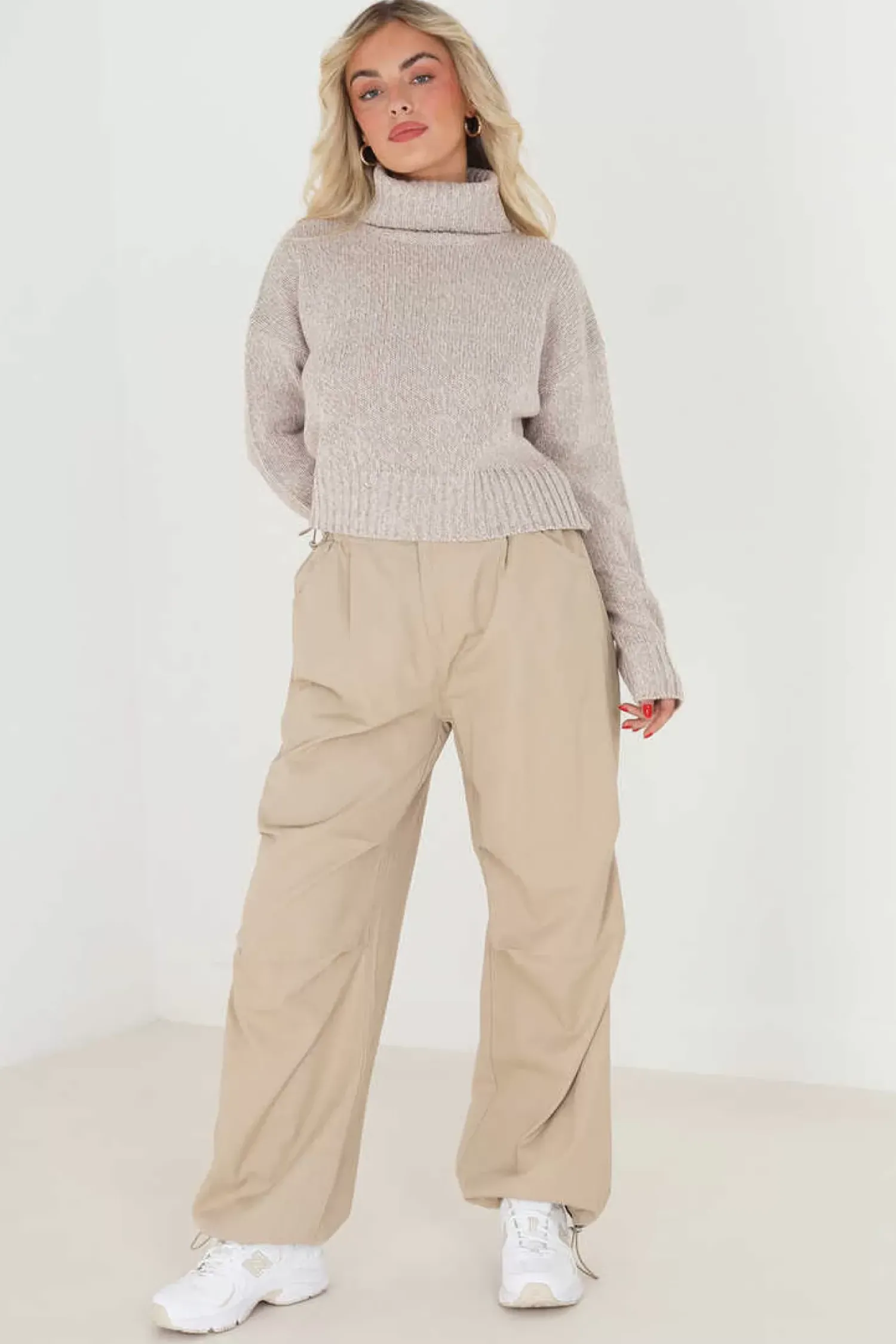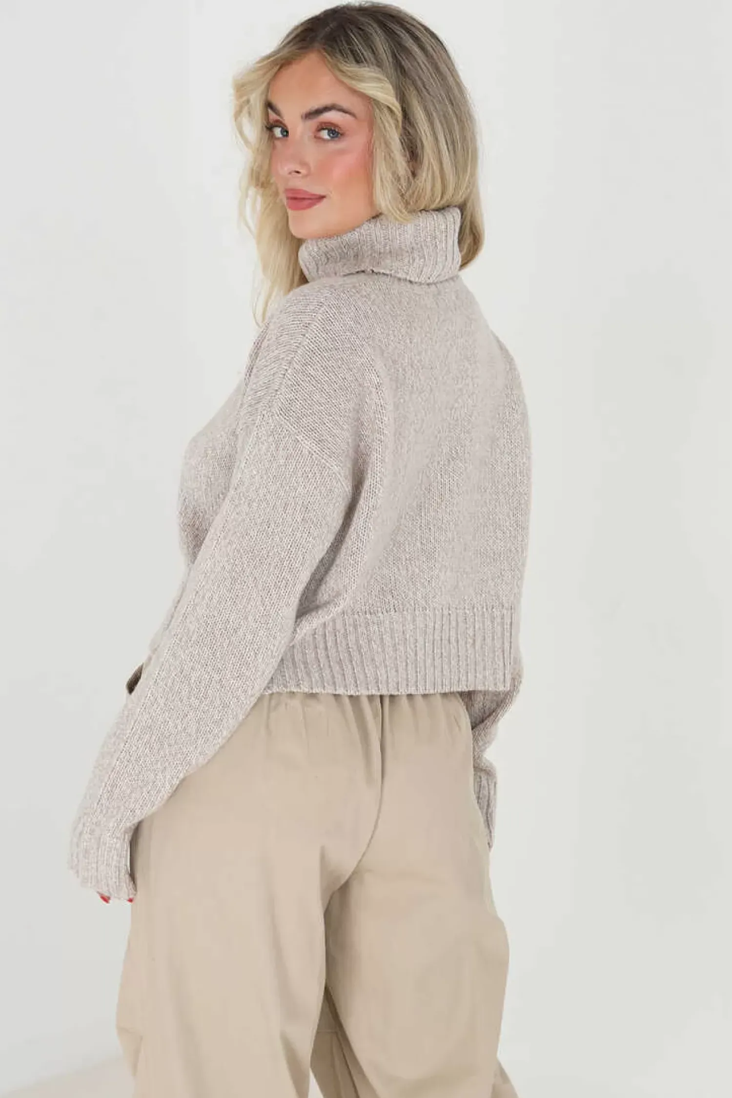 Camisola Cropped De Mulher Jaspeada De Gola Alta. Detalhe Canelado Na Gola, Parte De Baixo E Punhos