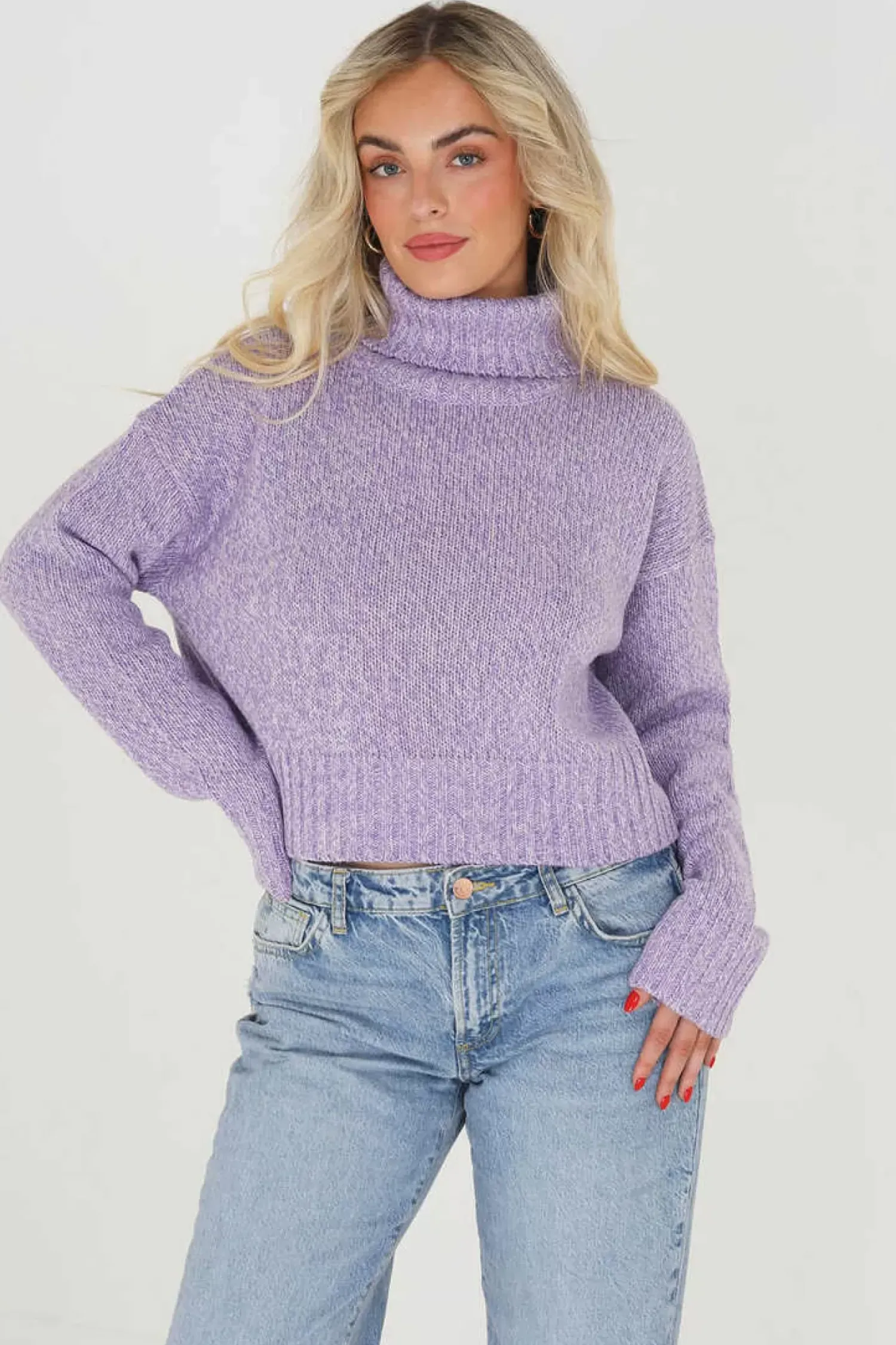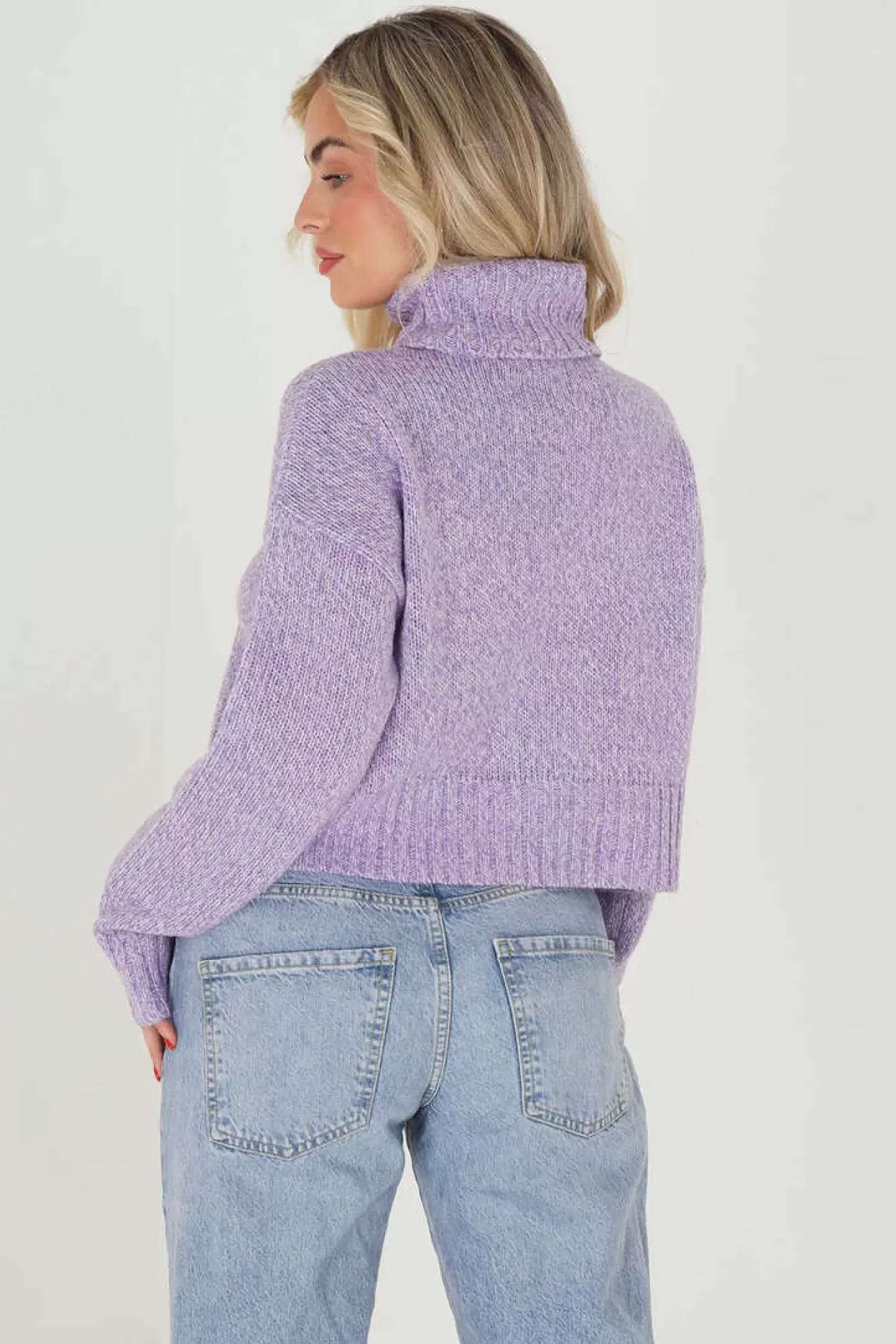 Camisola Cropped De Mulher Jaspeada De Gola Alta. Detalhe Canelado Na Gola, Parte De Baixo E Punhos