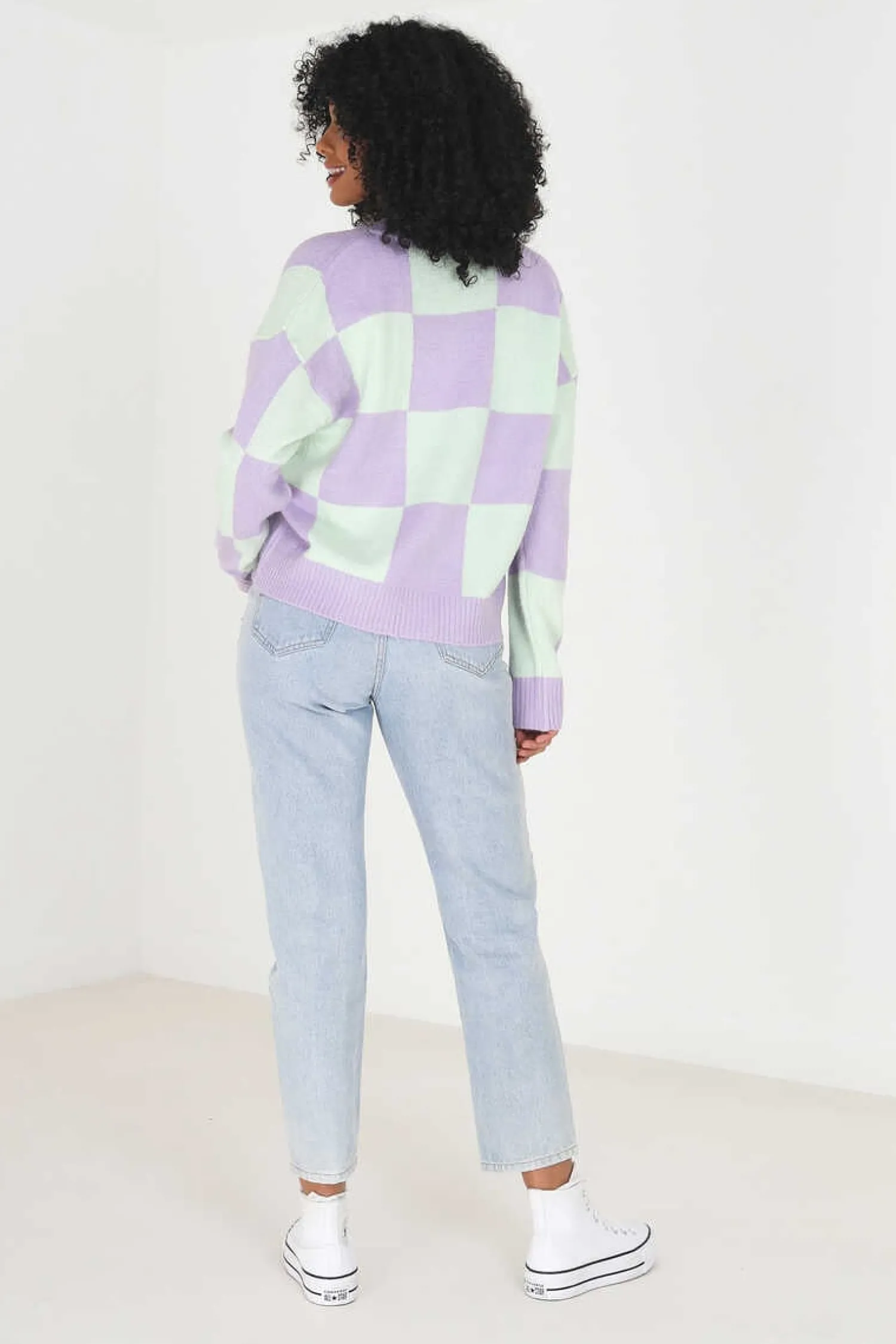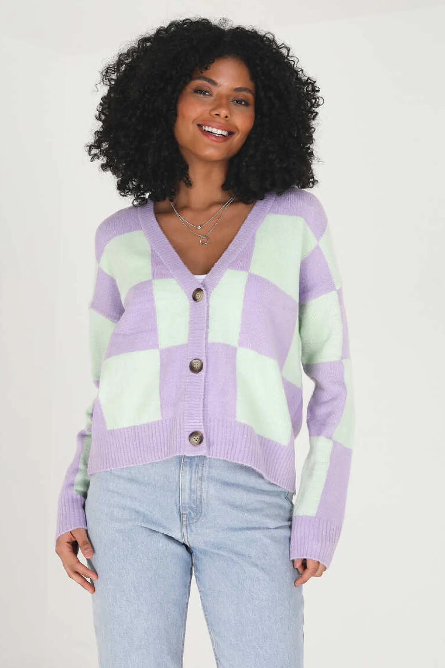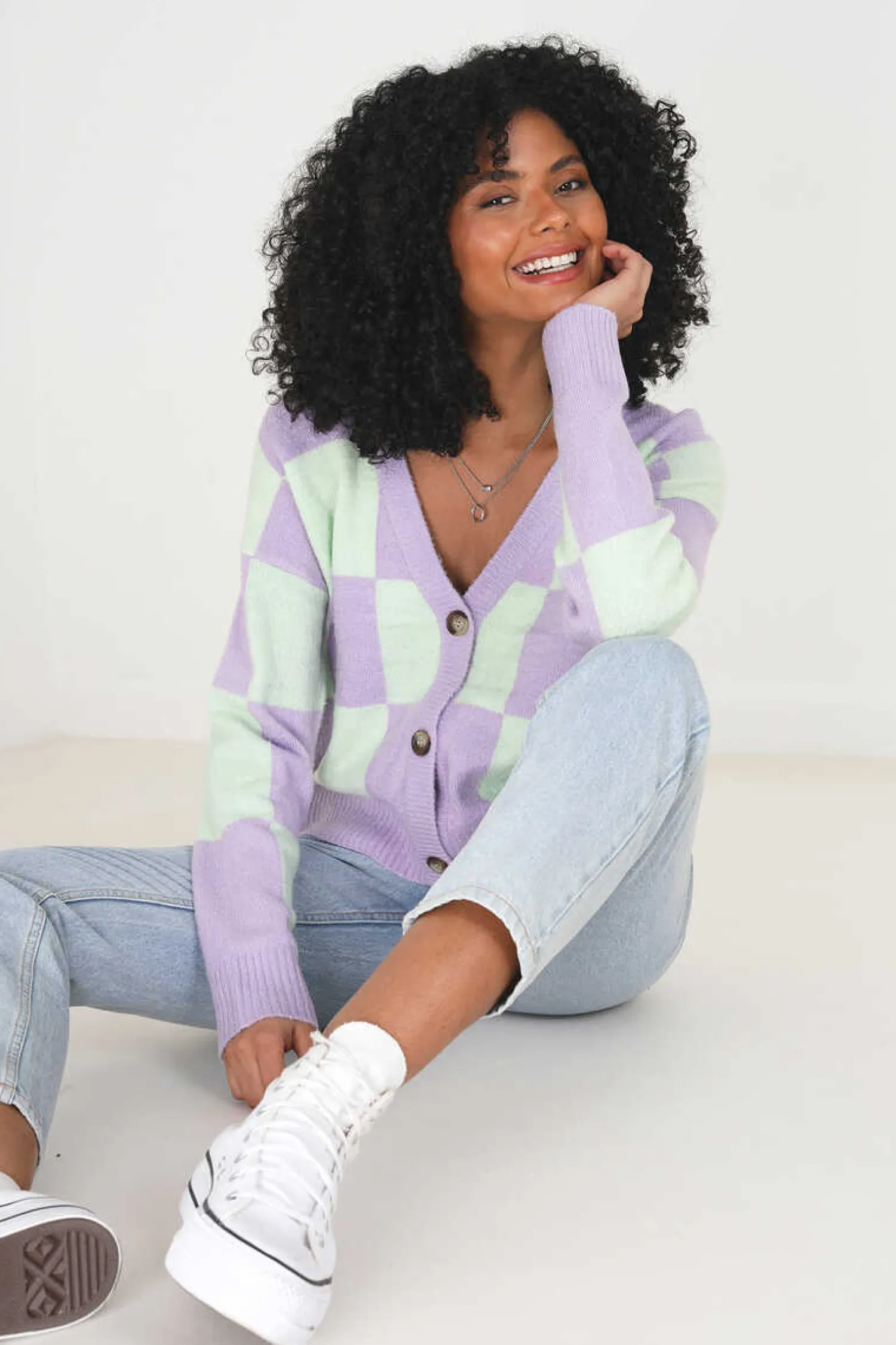 Casaco De Malha De Mulher Em Xadrez Com Tres Botoes. Decote Em Bico E Com Detalhe Canelado Na Gola, Parte De Baixo E Punhos