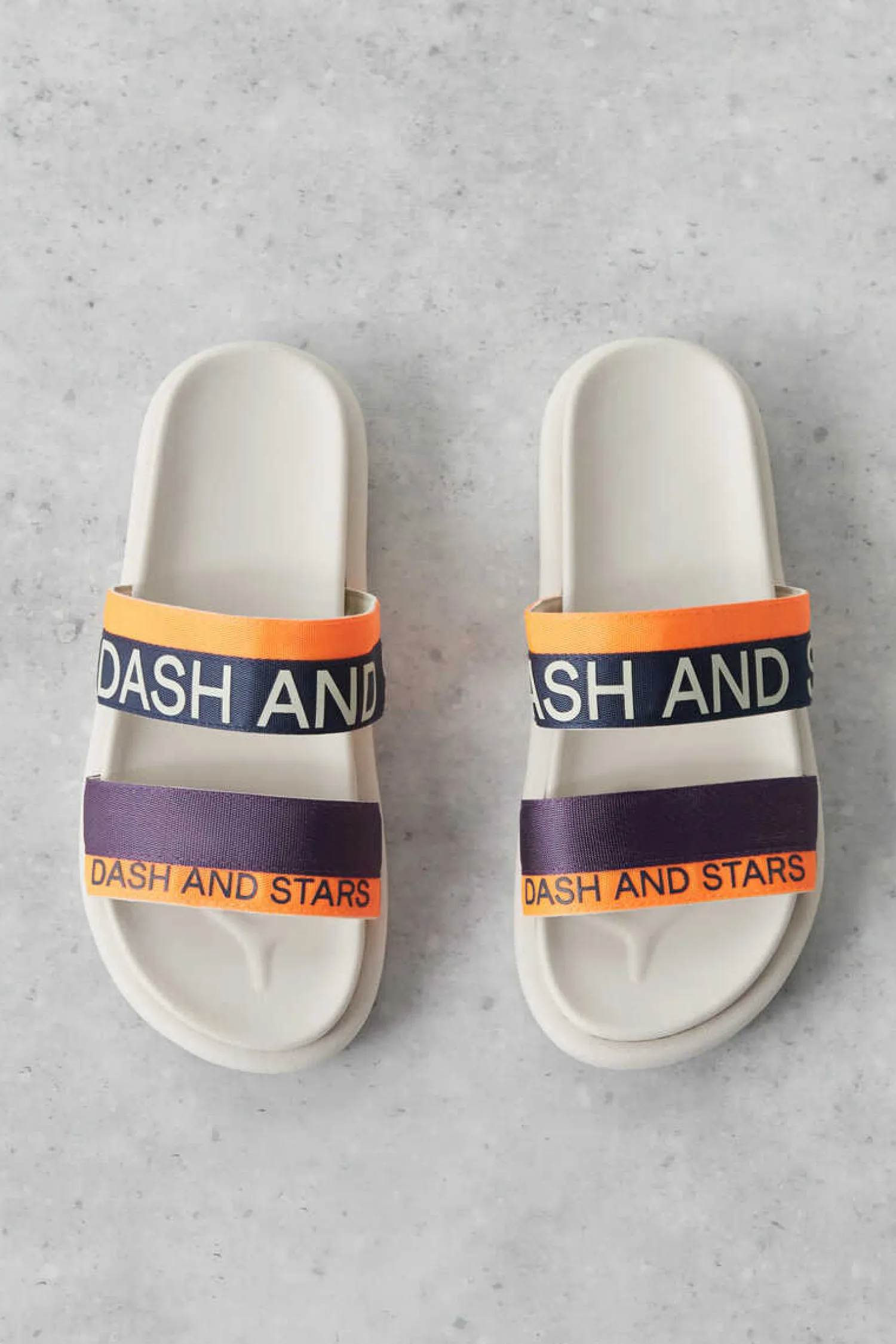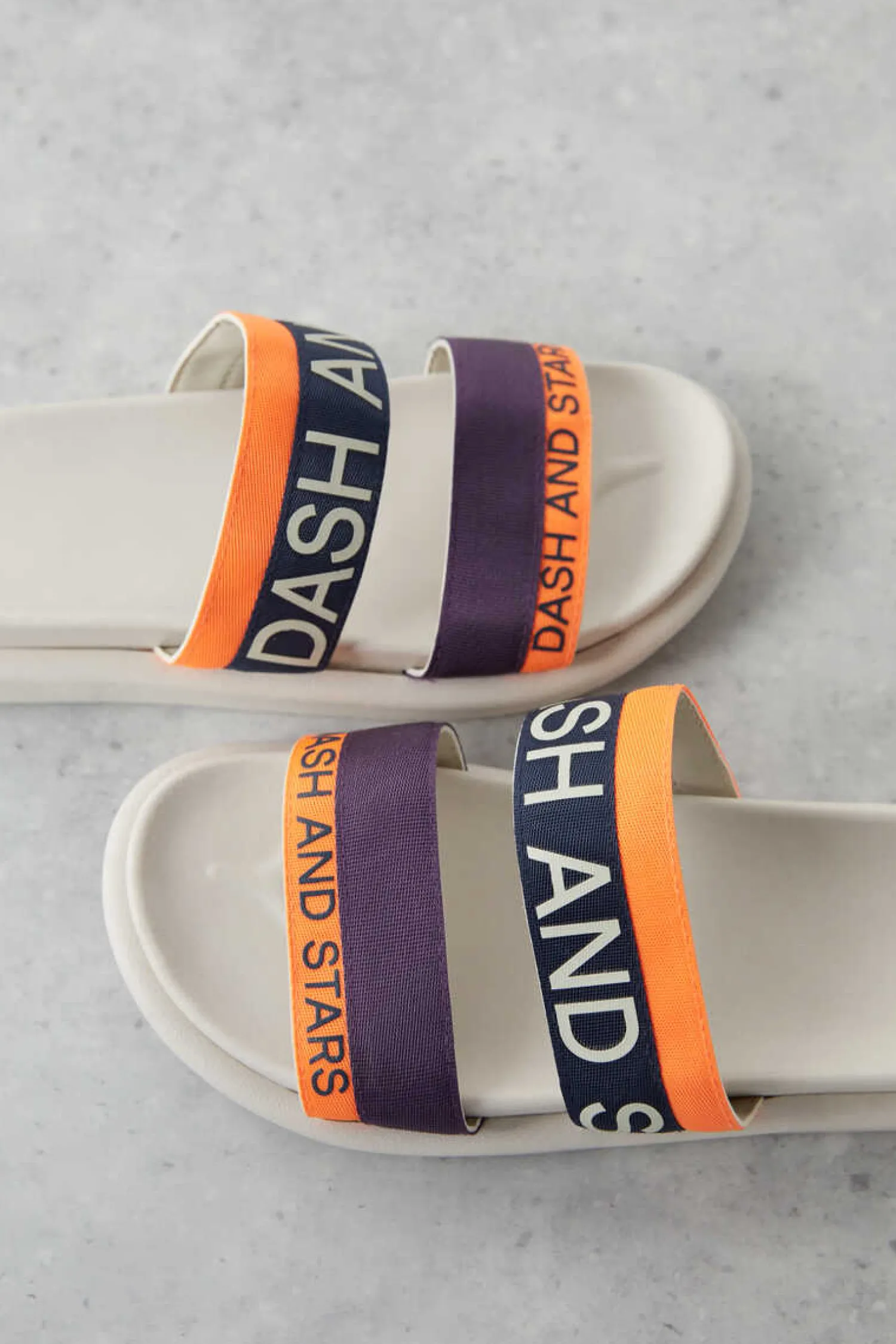 – Chinelos Com Dupla Tira Grossa E Detalhes De Cor Laranja-Fluor. Com Logo “Dash And Stars”, Estes Chinelos Sao O Ultimo Grito.