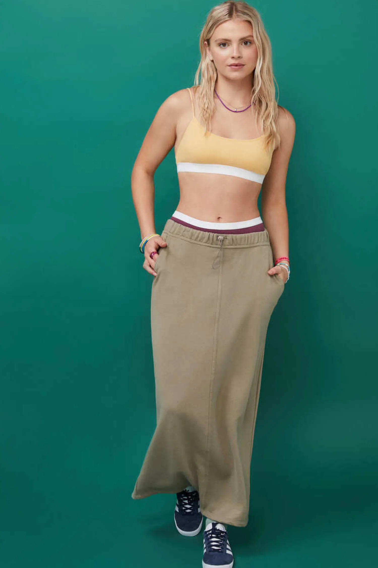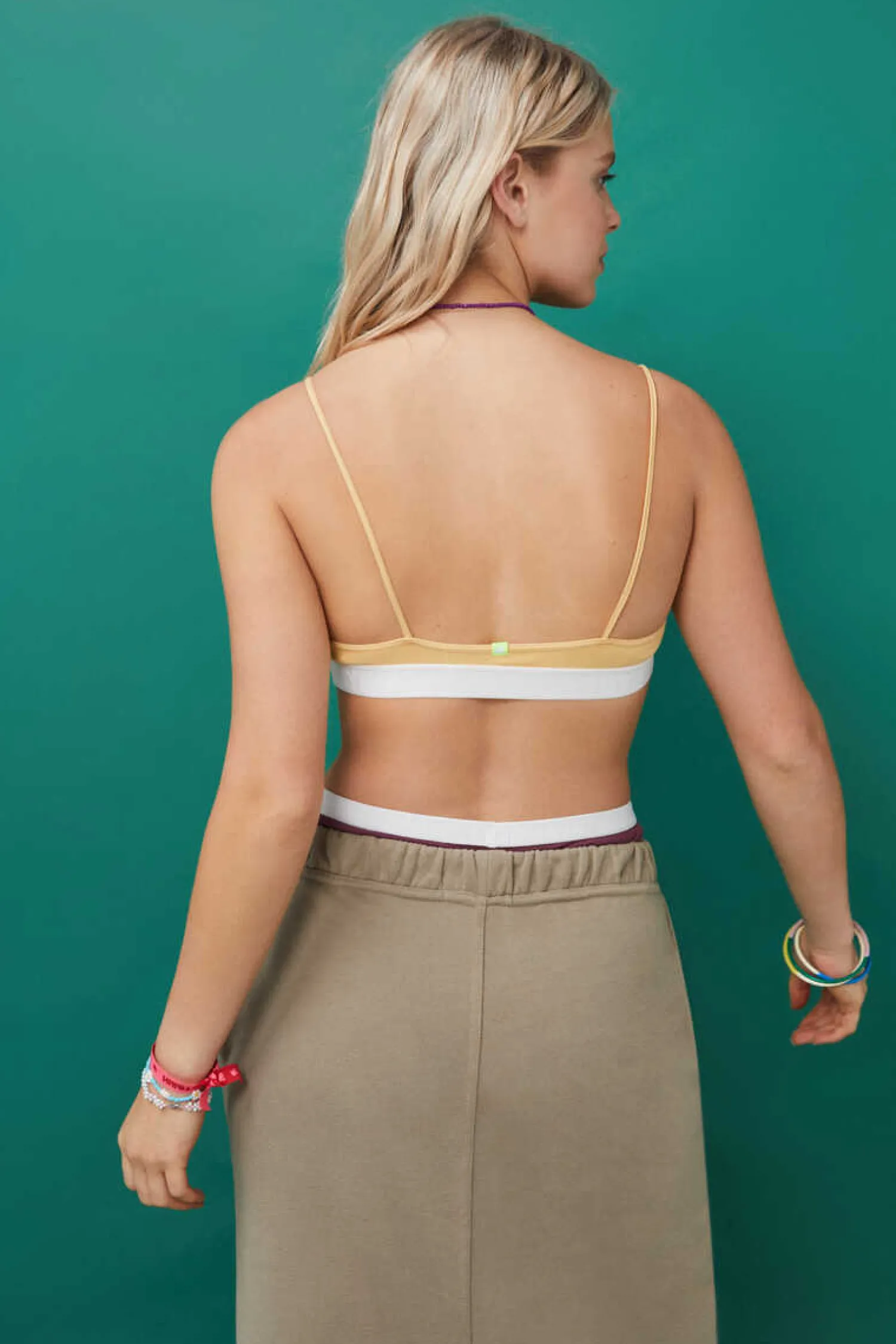 Soutien De Algodao Tipo Top, Com Comodas Copas De Por E Tirar. De Cor Amarela, Confecionado Em Tecido Rib (Canelado) E Detalhe De Elastico Sob O Peito.