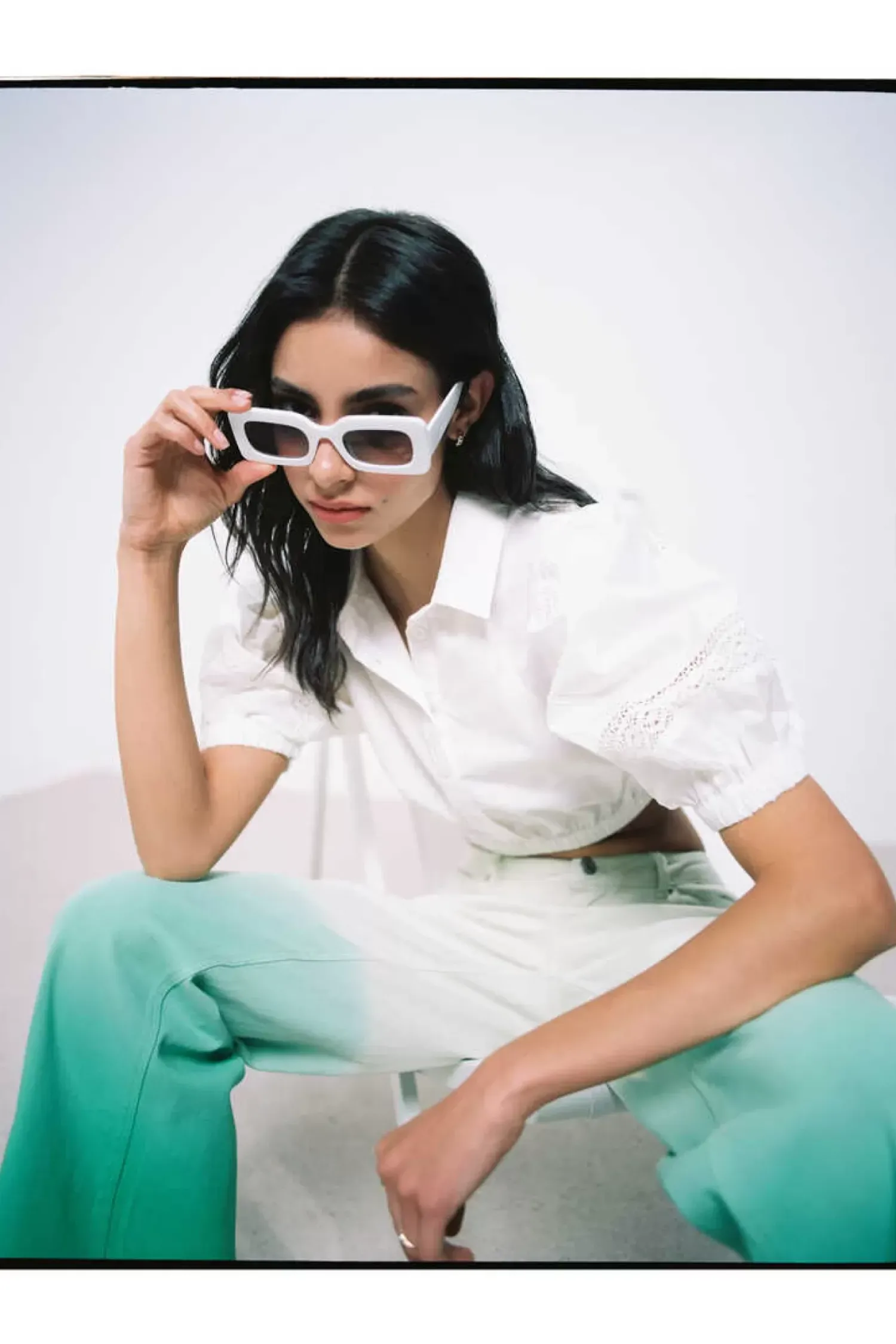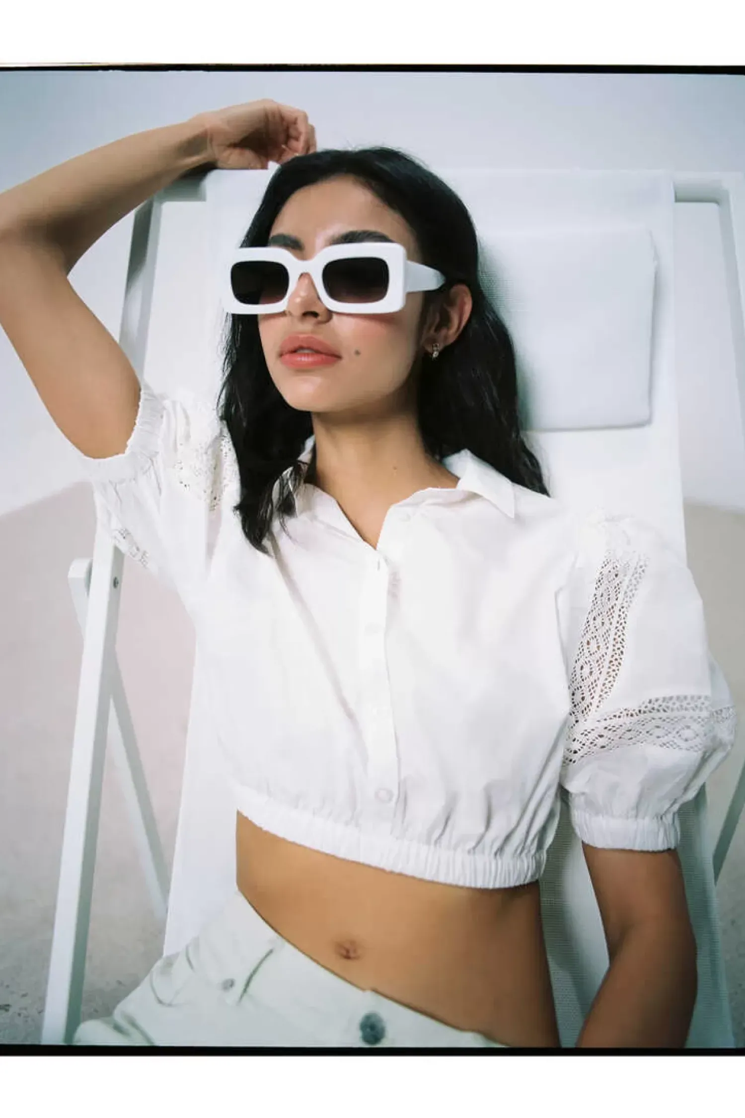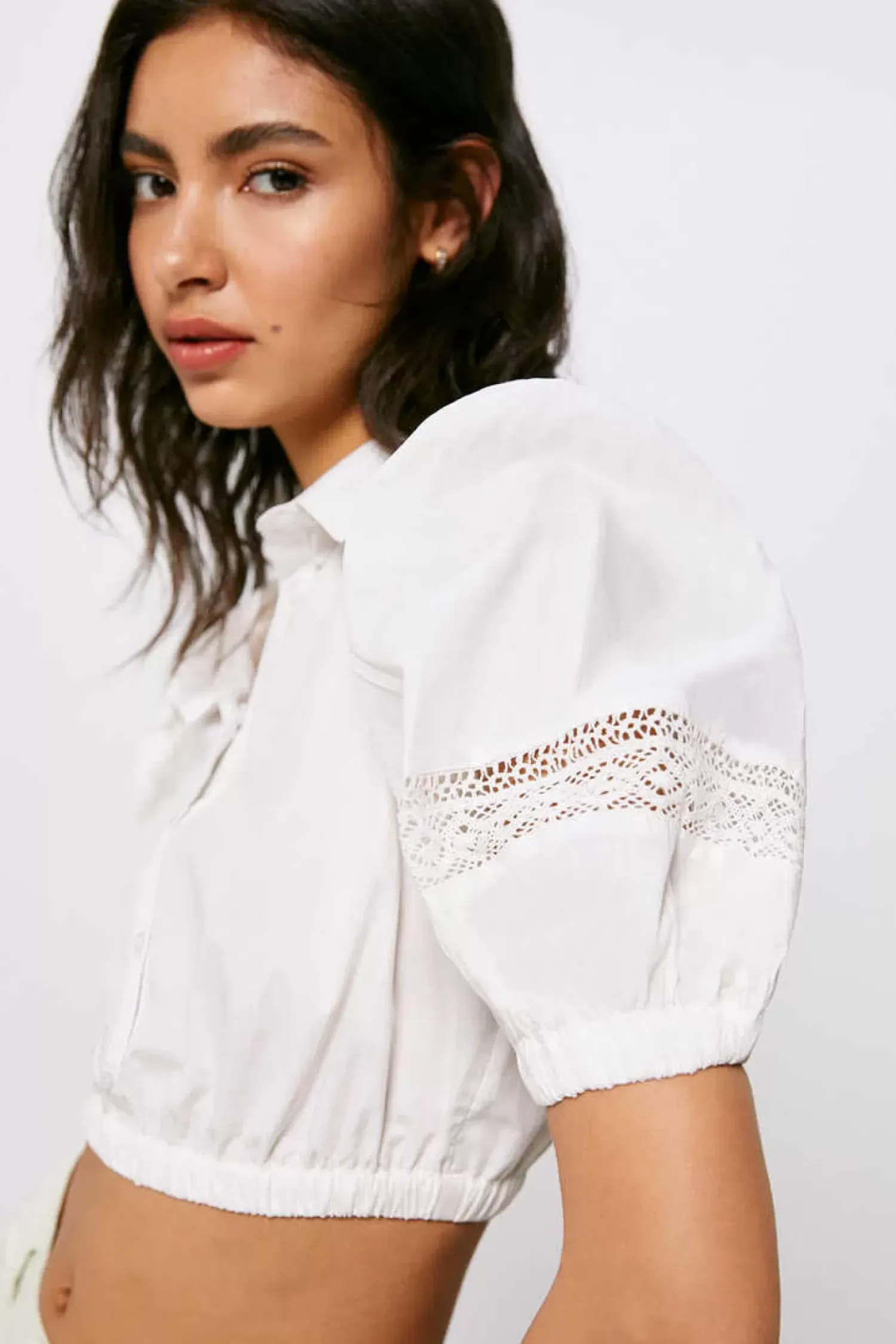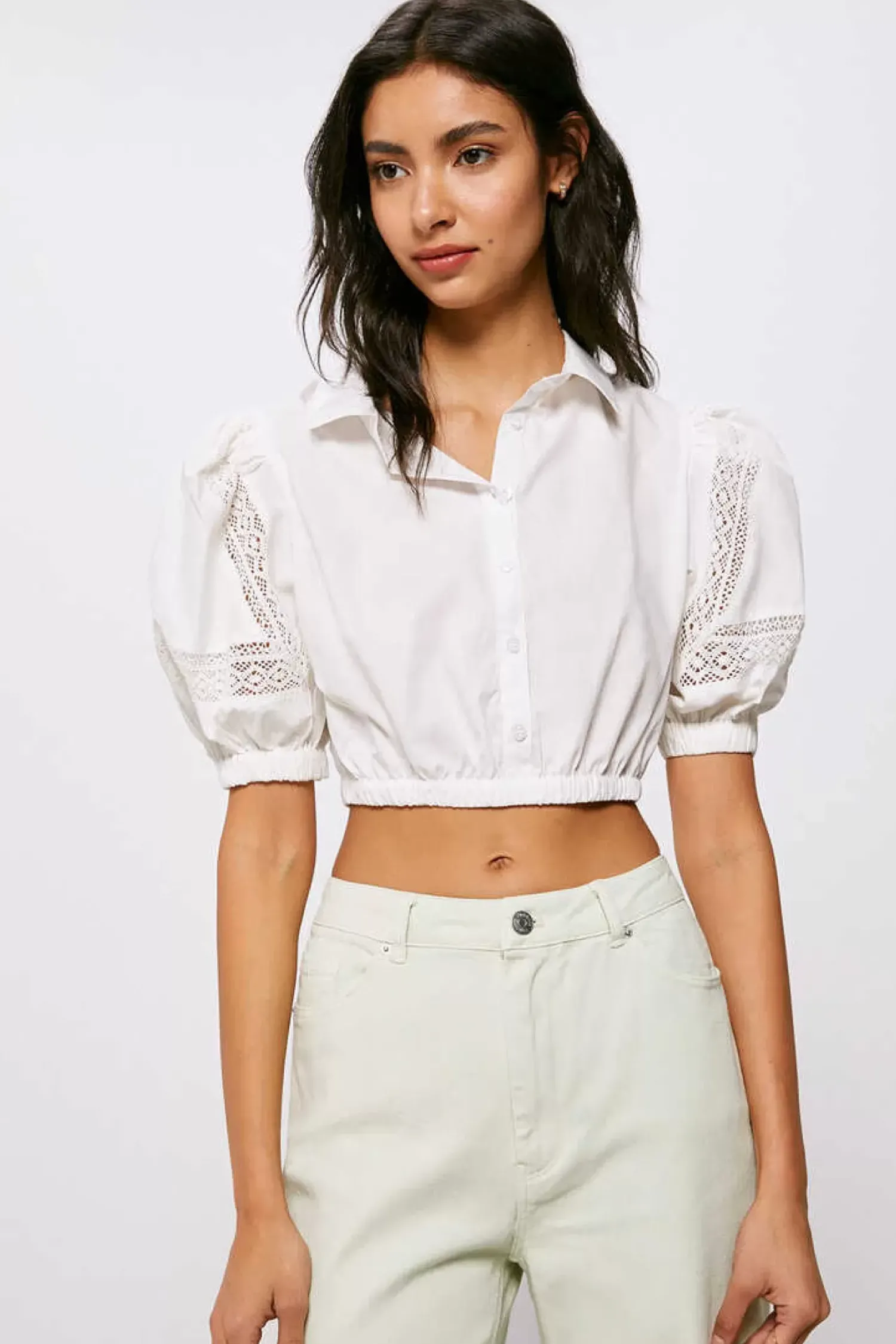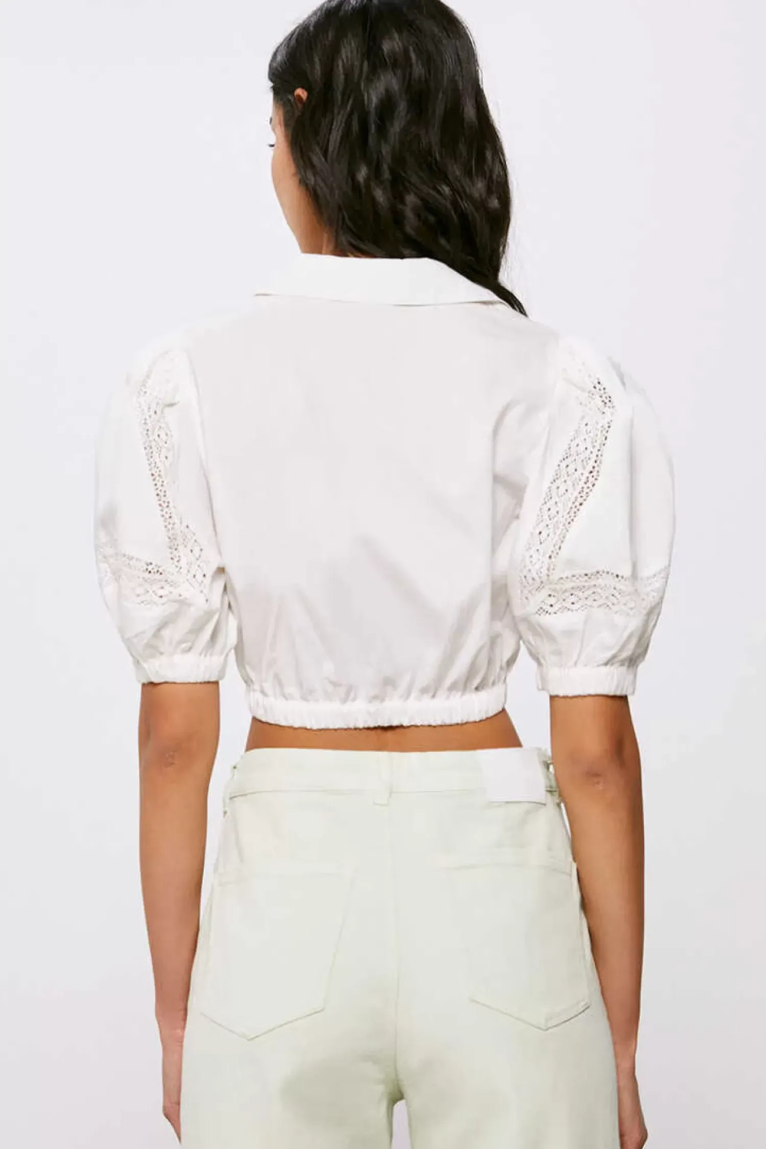 Blusa Curta De Manga Curta Com Volume, Com Detalhes De Lace Nas Mangas, Botoes Na Frente, Com Borracha Nas Mangas E Na Bainha.