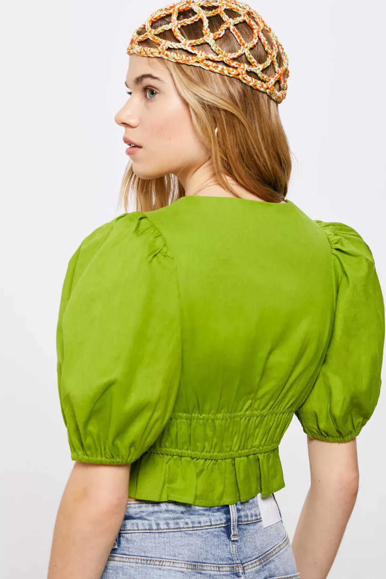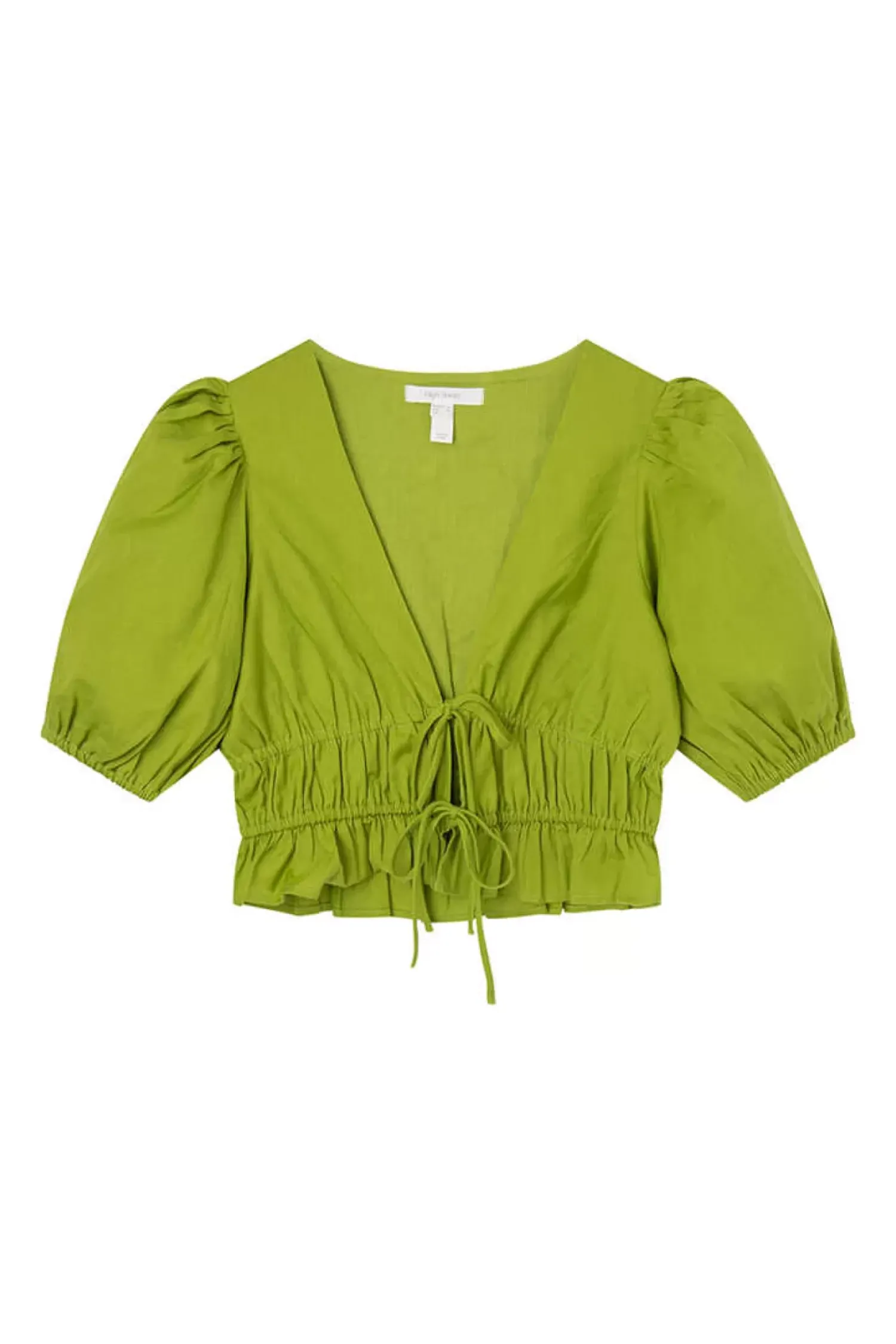 Blusa De Manga Curta Com Volume, Com Decote Em V, Com Nervuras Na Cintura, Com Fecho De Lacos Na Frente.