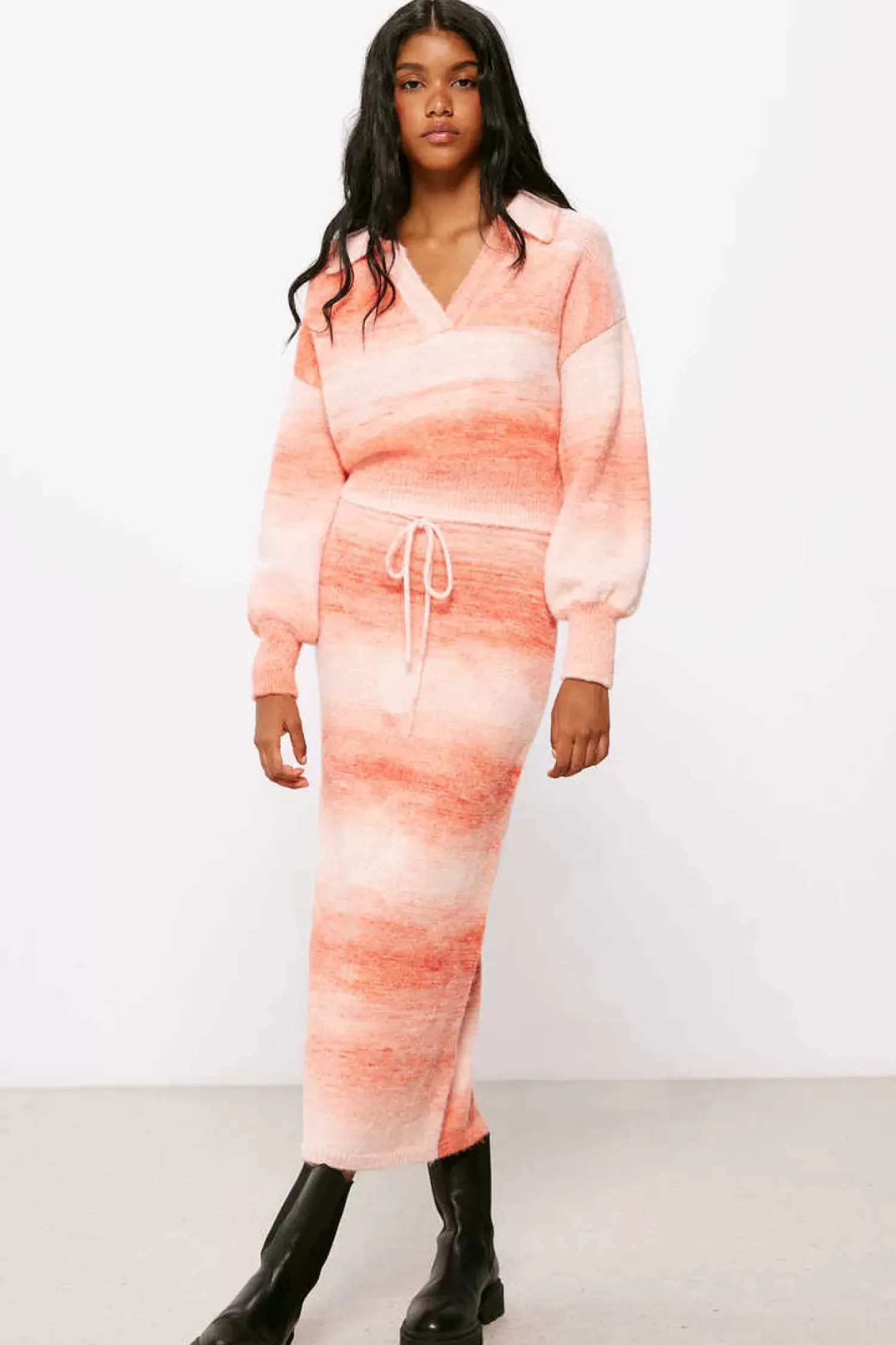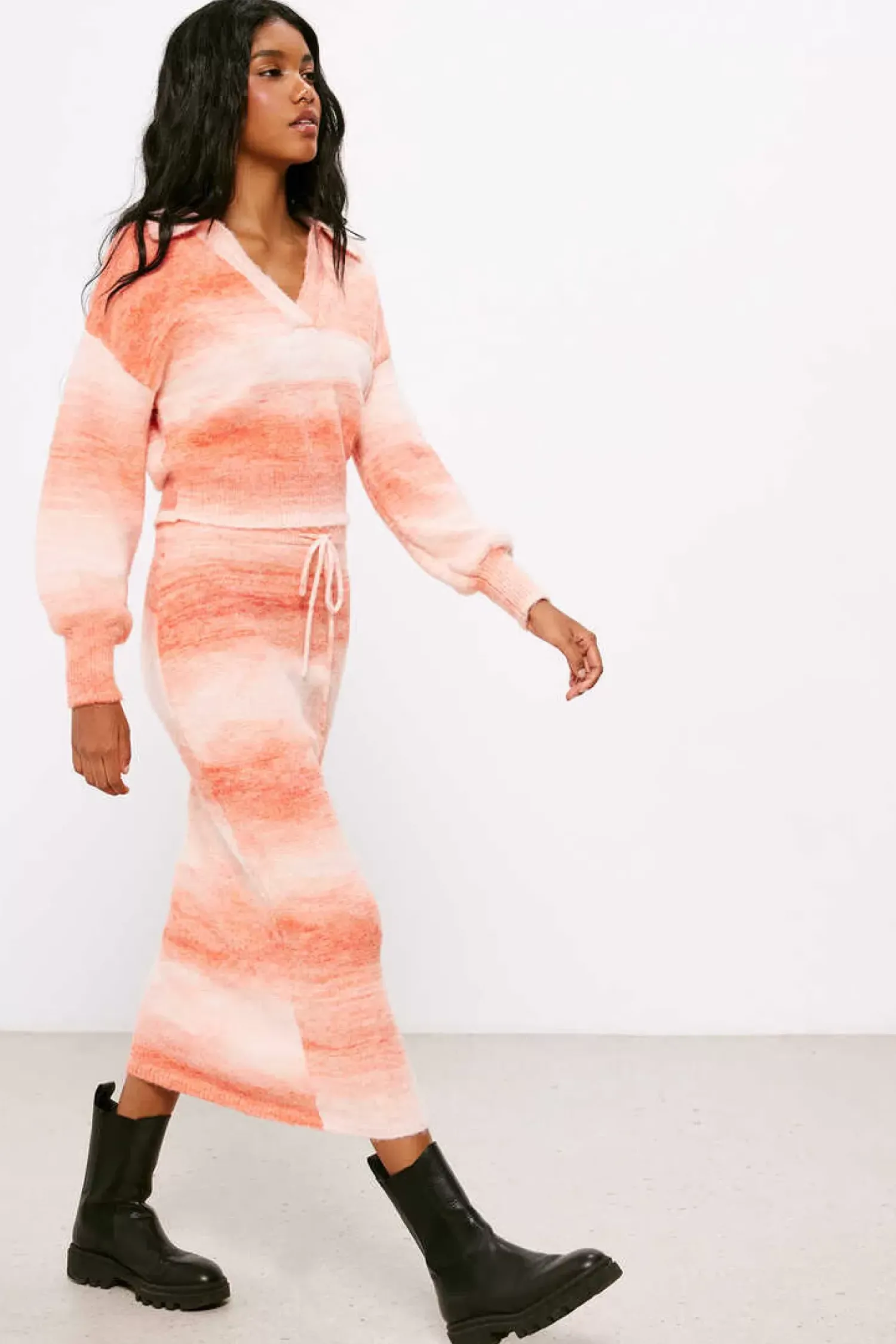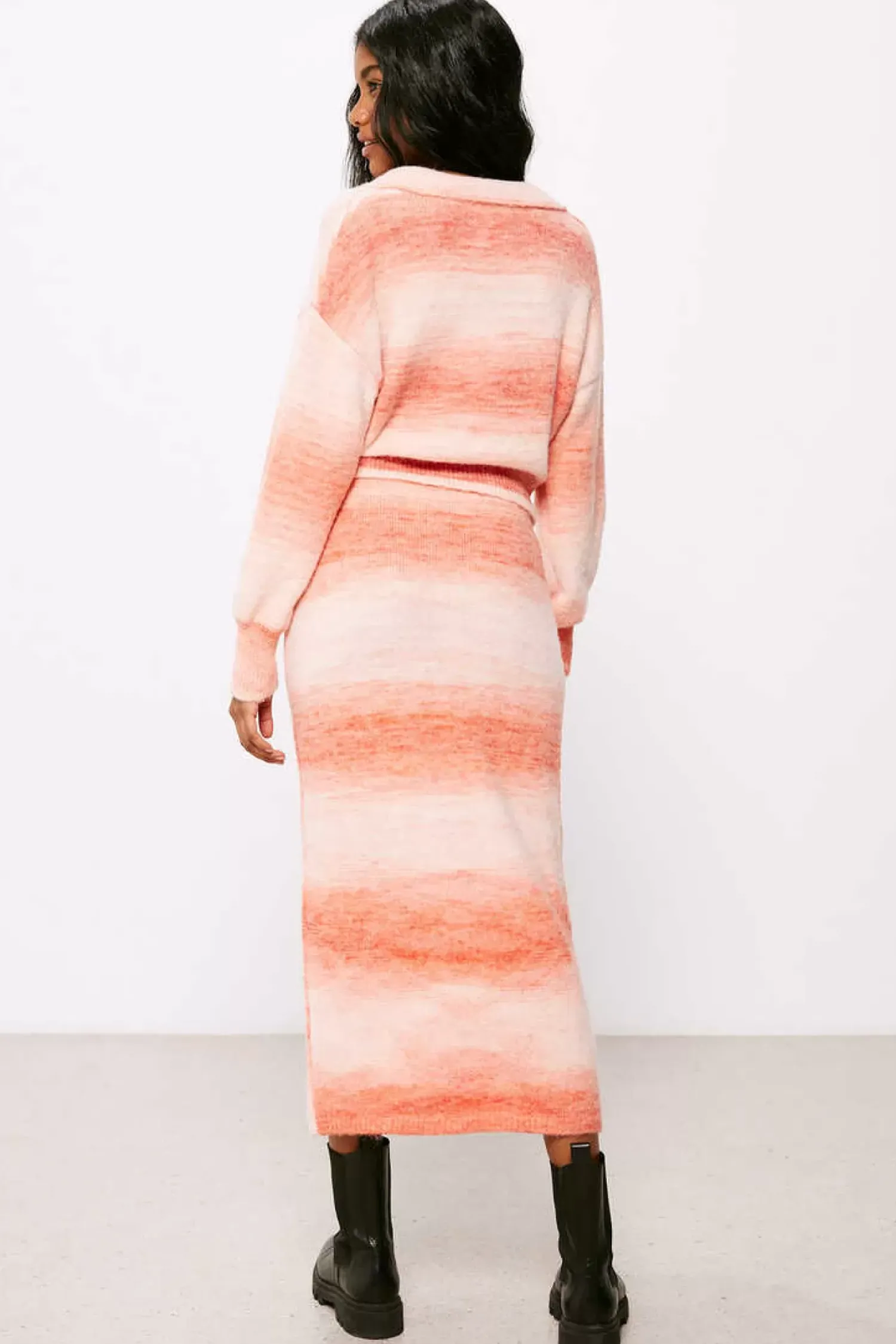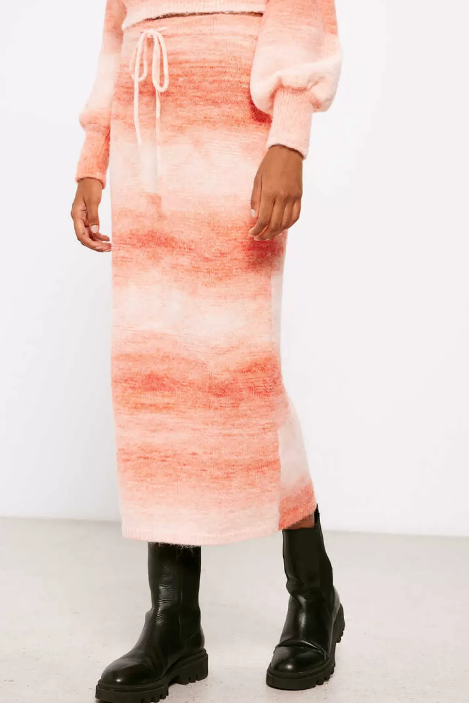 Saia Midi De Malha Ajustada, Com Elastico Na Cintura Com Laco Ajustavel, Com Riscas Esfumadas Em Tom Rosa.