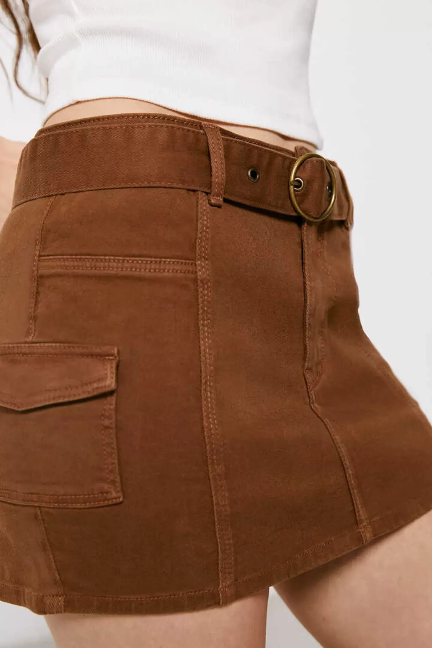 Minissaia De Algodao, Com Bolsos De Envelope Laterais, Com Fecho De Botao E Fecho-Eclair, Detalhe De Costuras E Cinto Com Fivela Metalica Redonda.