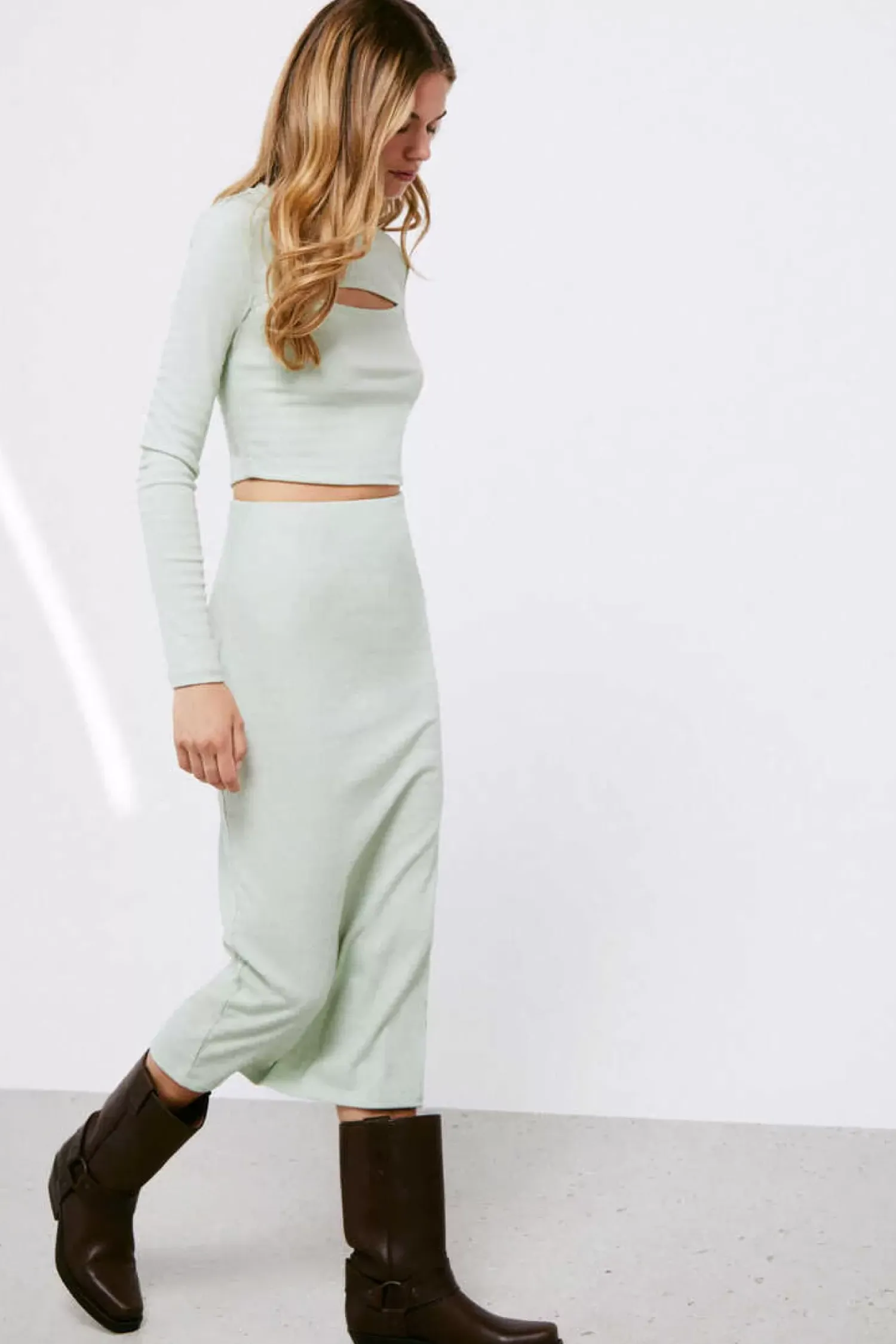 Saia Midi De Tubo Justa, Com Borracha Na Cintura E De Cor Lisa.