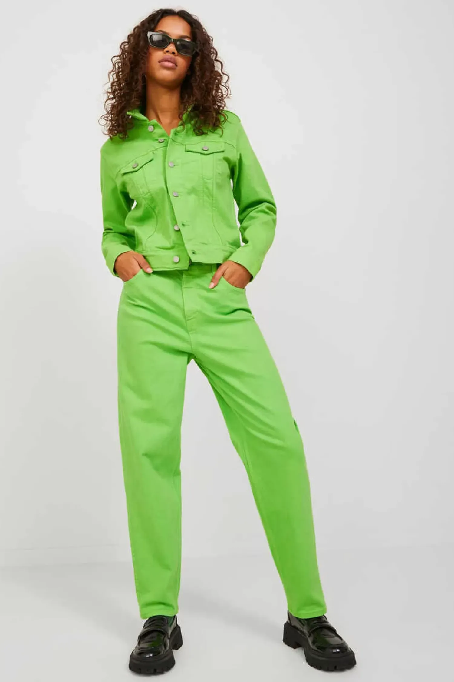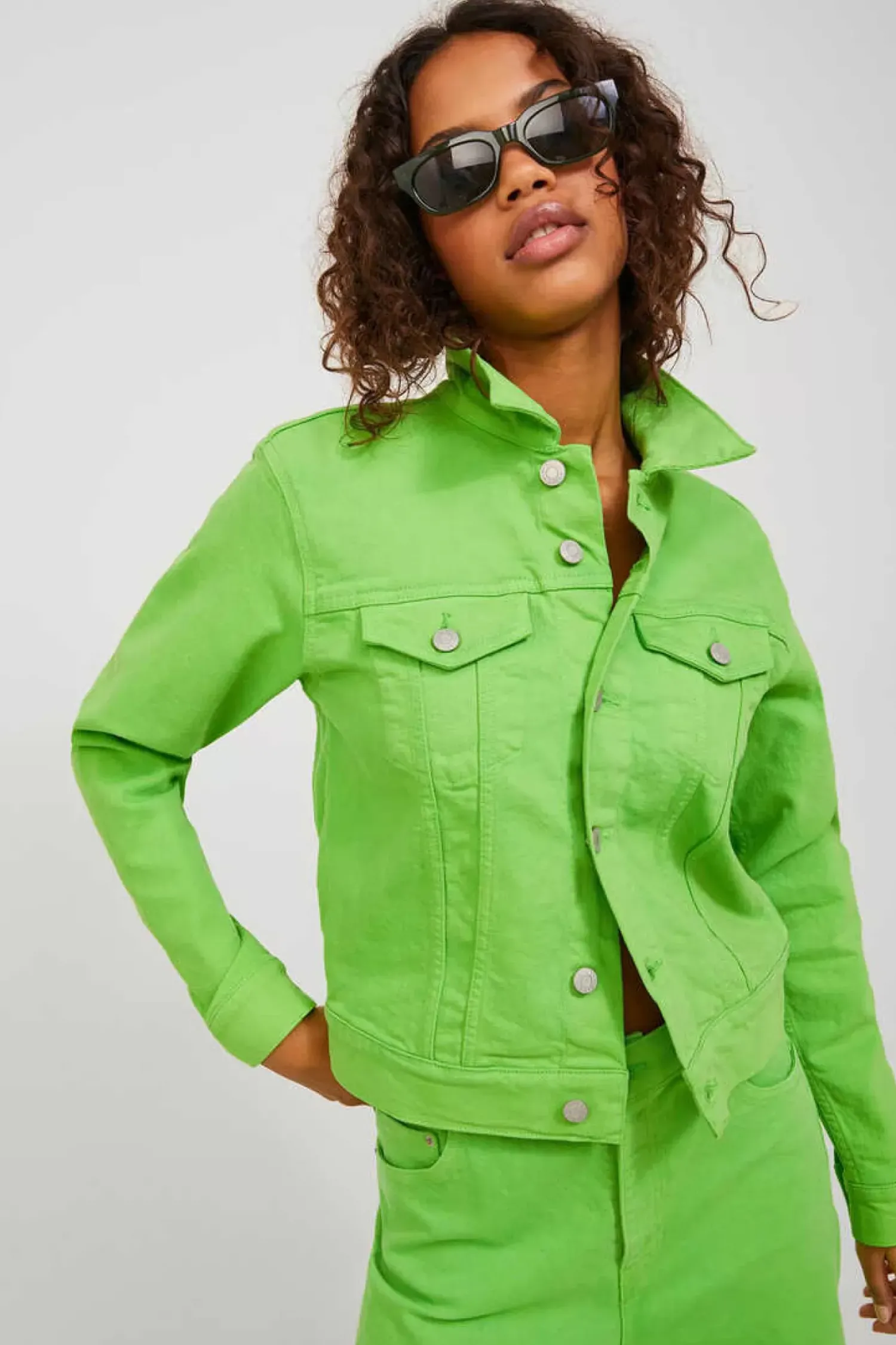 Blusao Denim Cor. Fecho A Frente Com Botoes. Punhos Com Botao. Tecido Denim. Bolsos No Peito. A Modelo Leva O Tamanho S