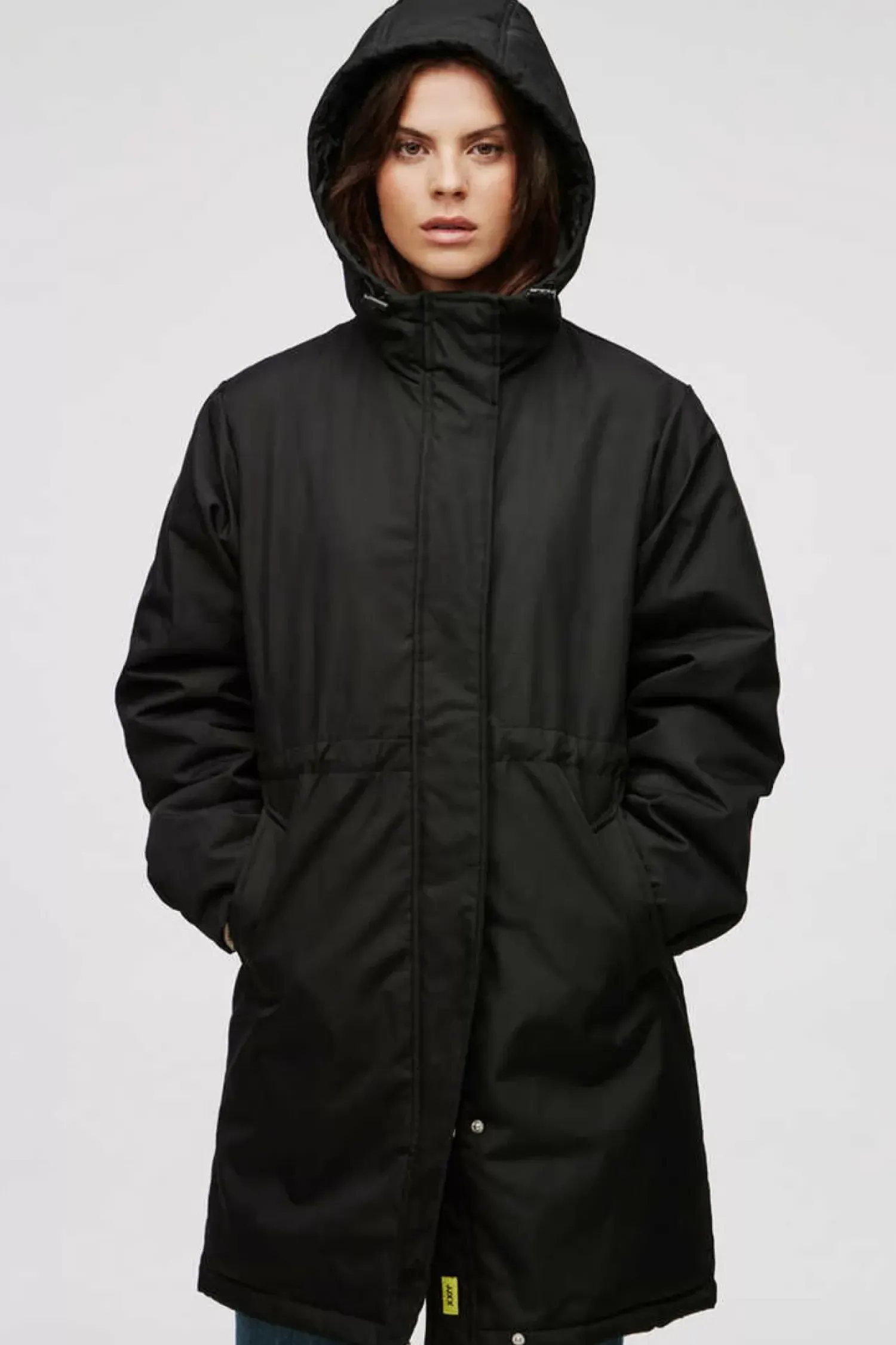 Parka Preta De Mulher Com Gola Alta, Capuz Comodo E Cintura Ajustavel. Sobretudo Com Cores Basicas E Fundo De Armario. Bolsos Comodos E Uteis. Comprimento 3/4. … Fecho-Eclair E Botoes De Pressao Para Maior Versatilidade. Ver Mais
