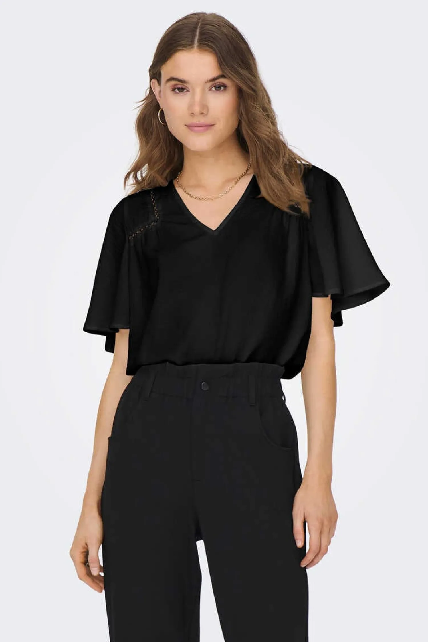 Blusa Com Mangas Curtas Fluidas, Gola Em Bico E Detalhes De Bordado.