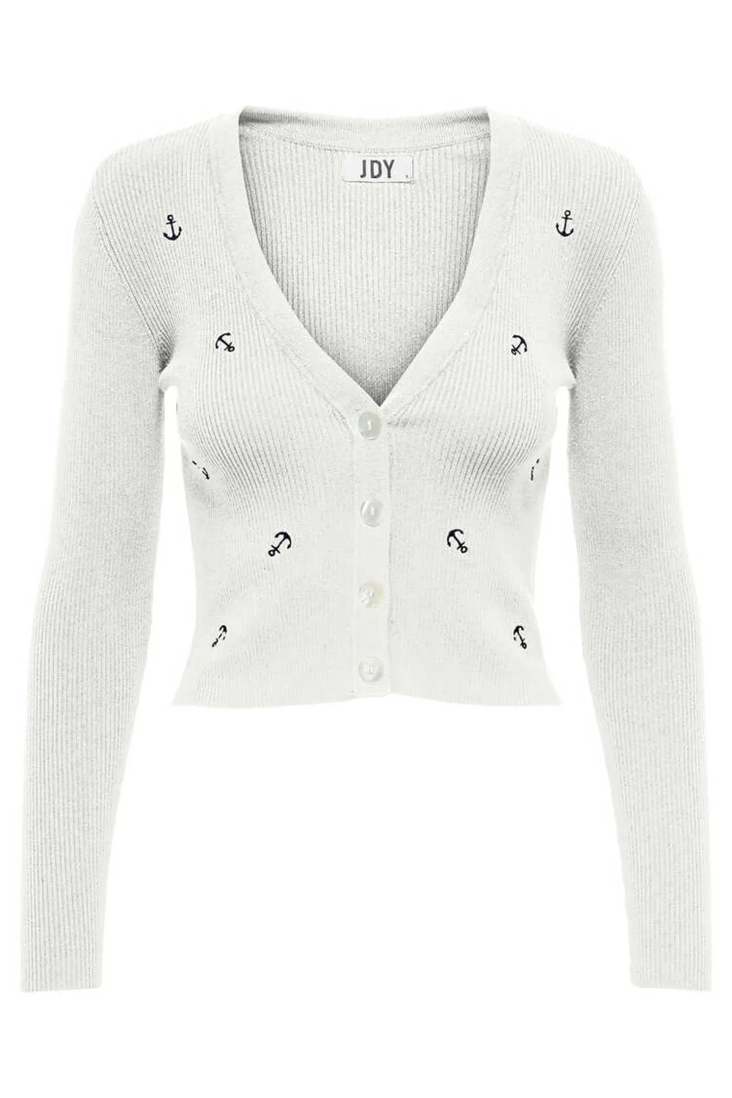 Casaco De Malha Gola Em Bico Pronunciado, Estampado De Coracoes E Botoes Frontais. Detalhe De Bordado.