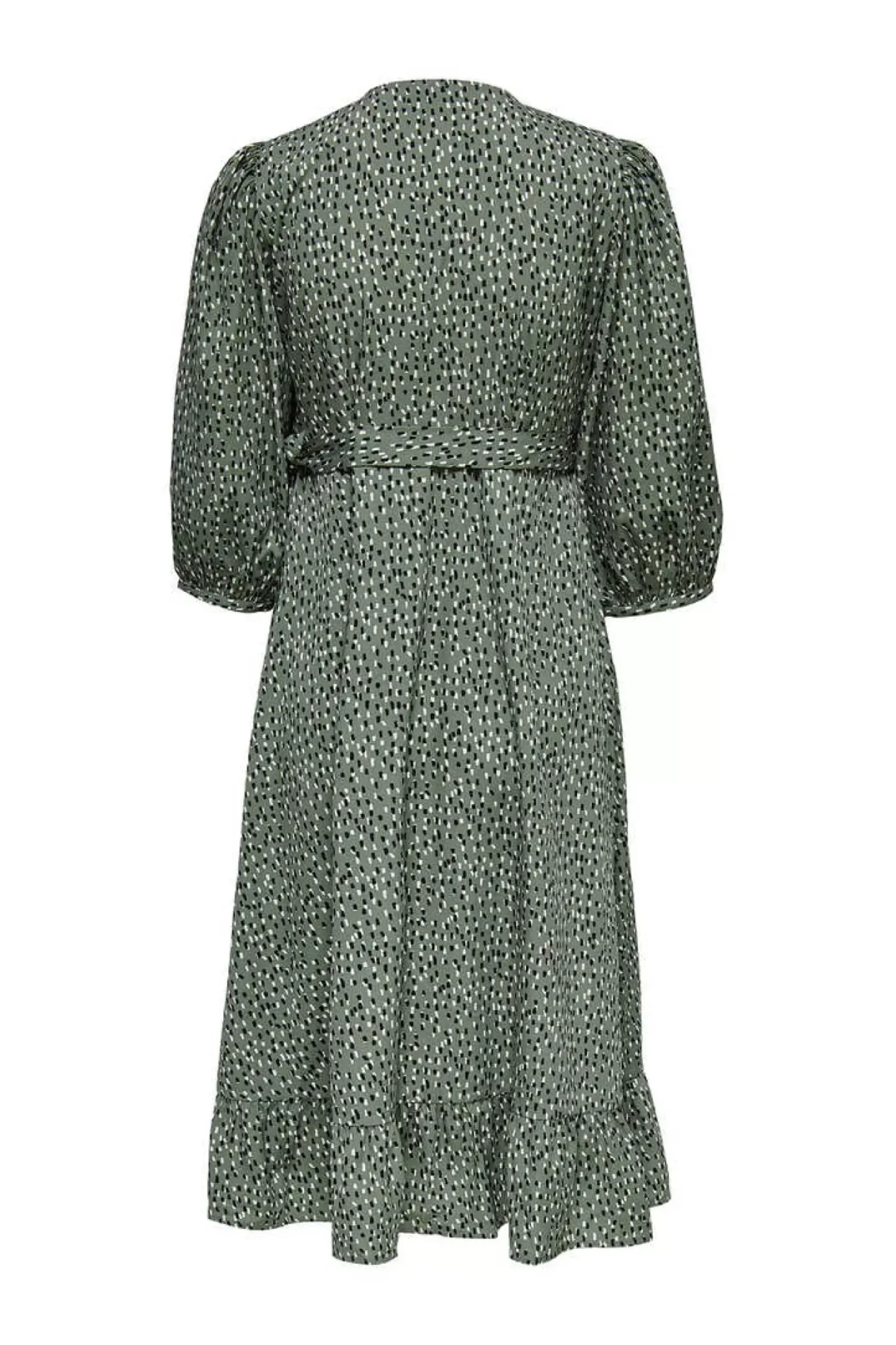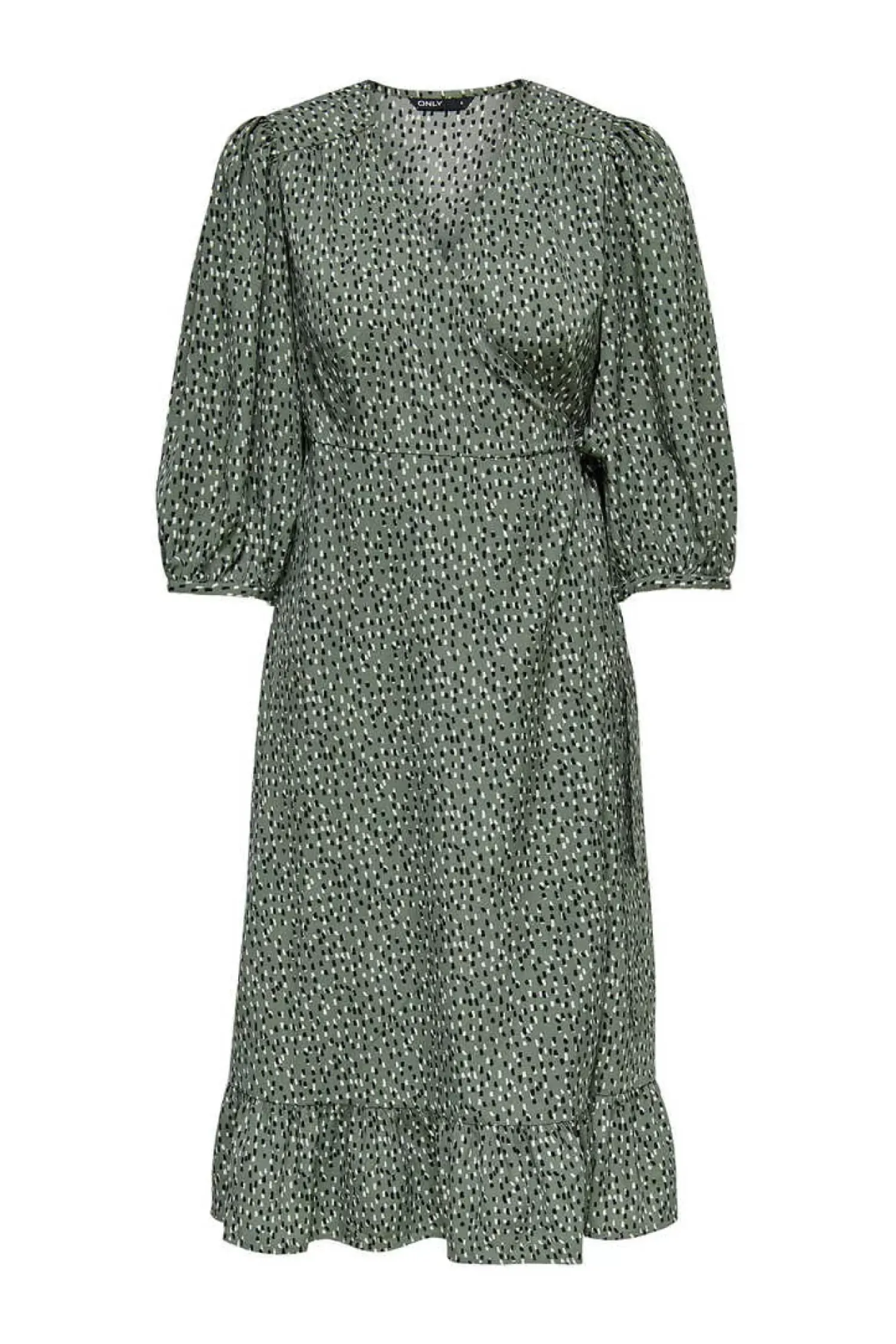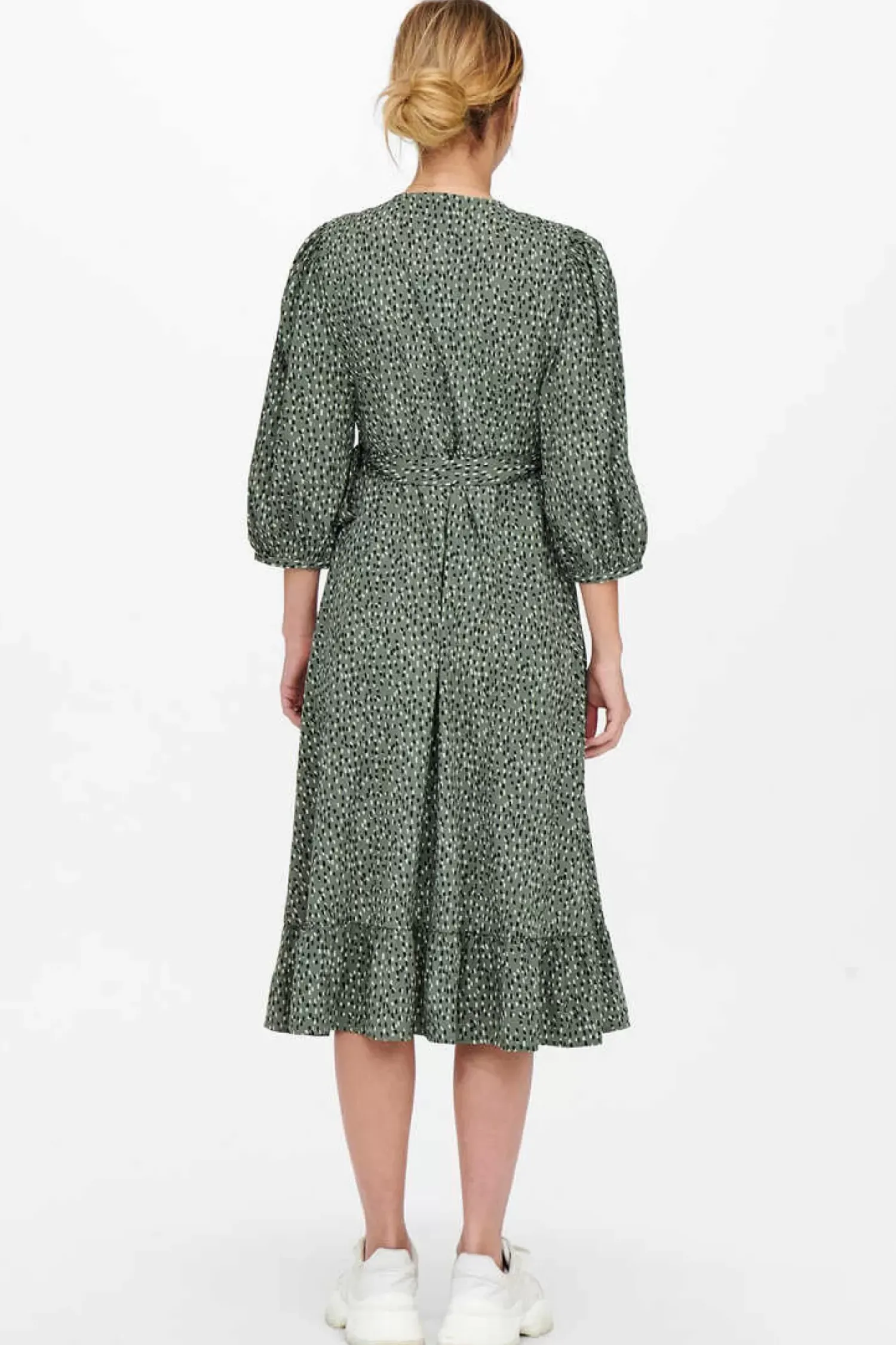 Vestido Cruzado Midi Com Manga 3/4 E Decote Em Bico. Detalhe De Folho Na Bainha.