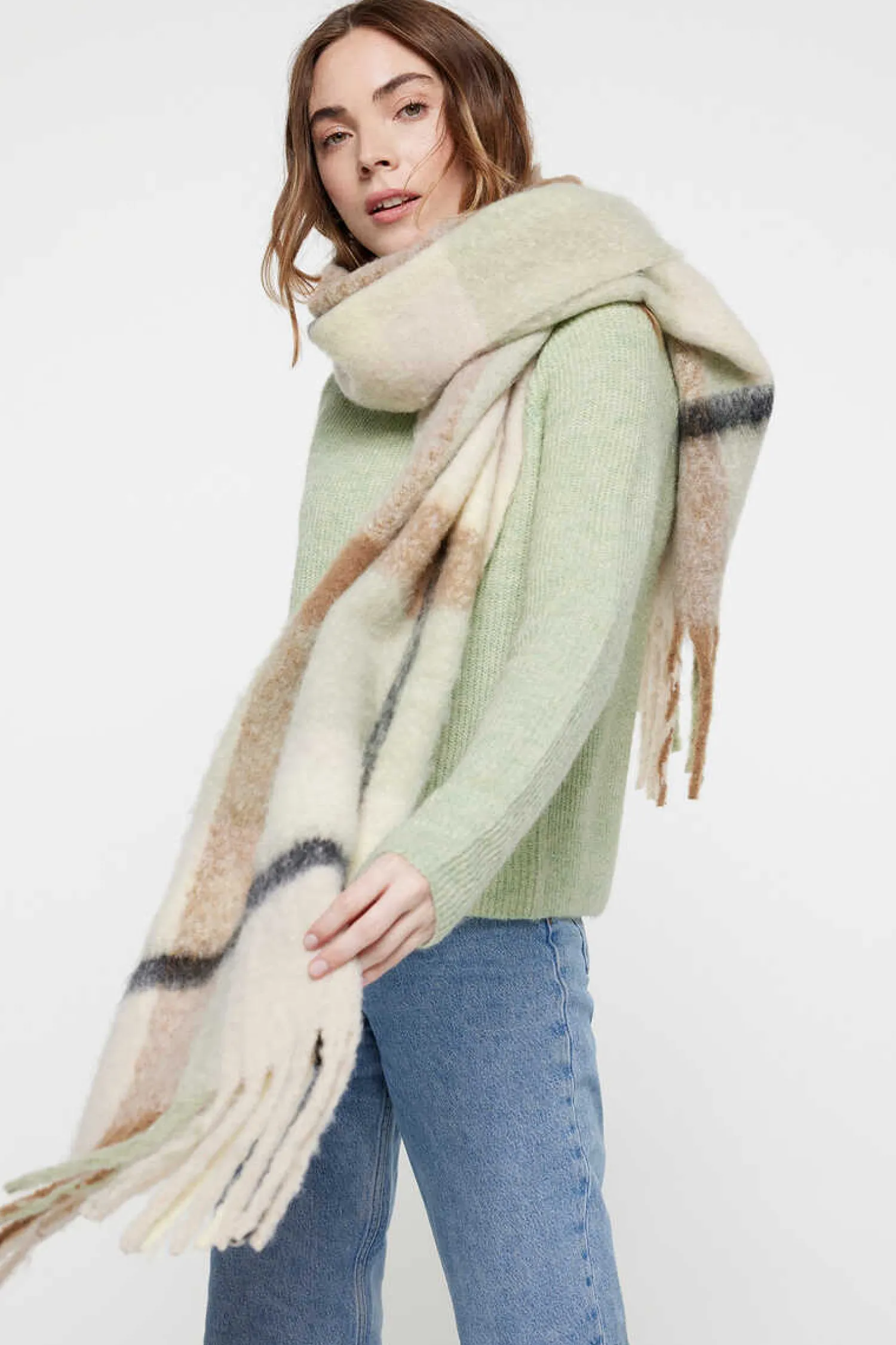 Cachecol Comprido De Quadrados E De Tato Suave, Com Franjas Nas Bordas. Confecionado Com Materiais Reciclados.
