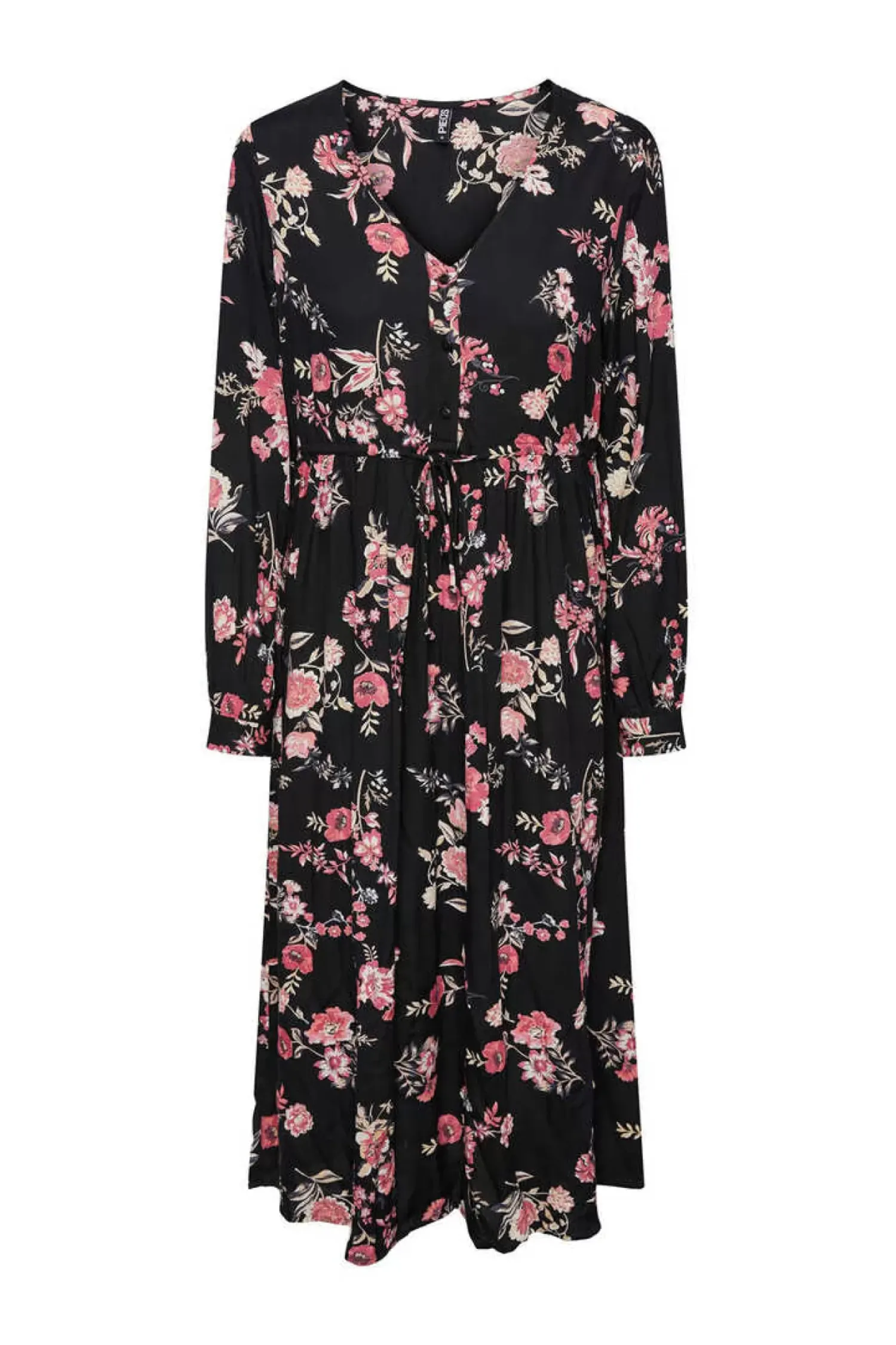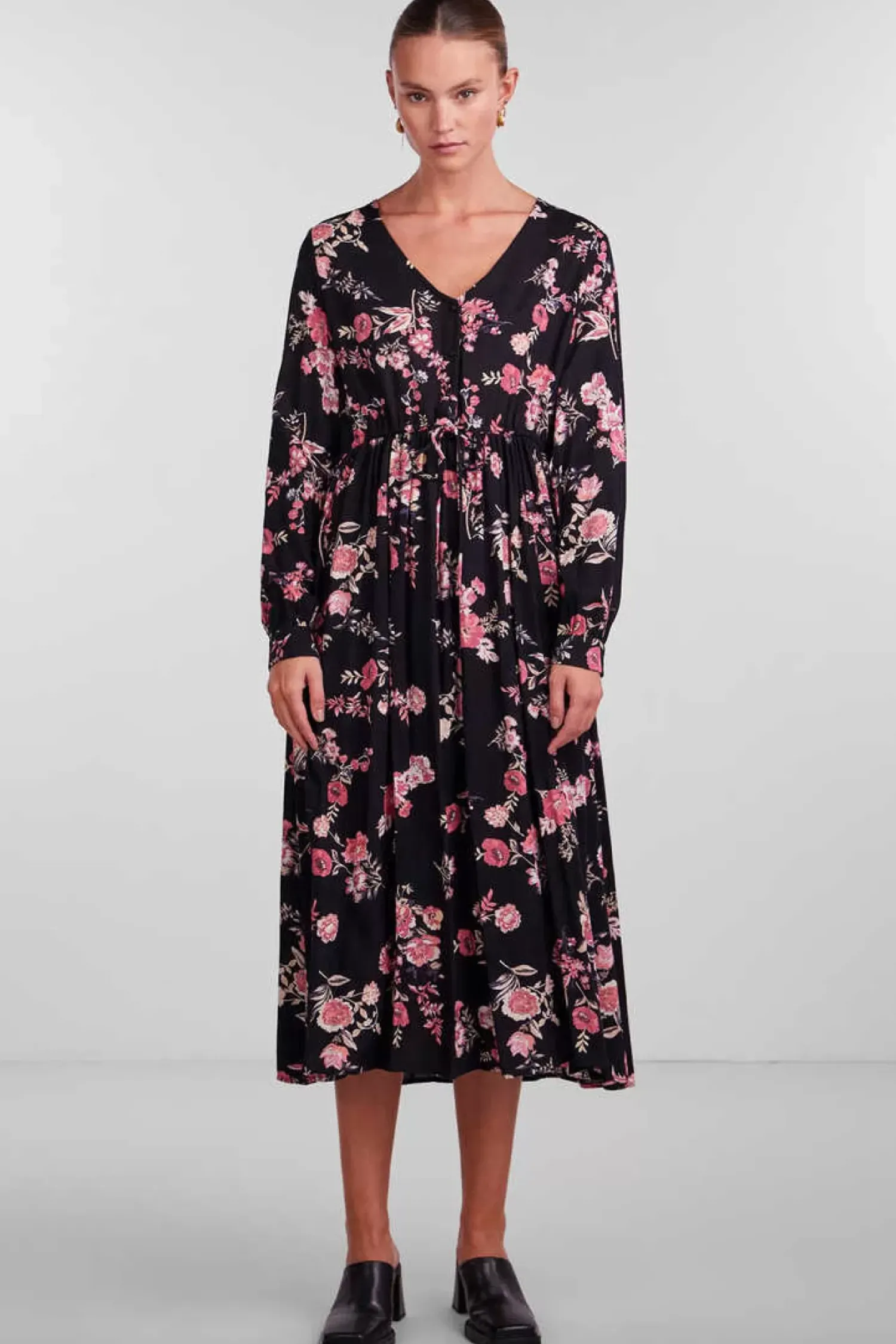 Vestido Midi Com Estampado Floral E Manga Comprida. Gola Em Bico E Detalhe De Botao No Punho. Cordao Na Cintura Para Ajustar.