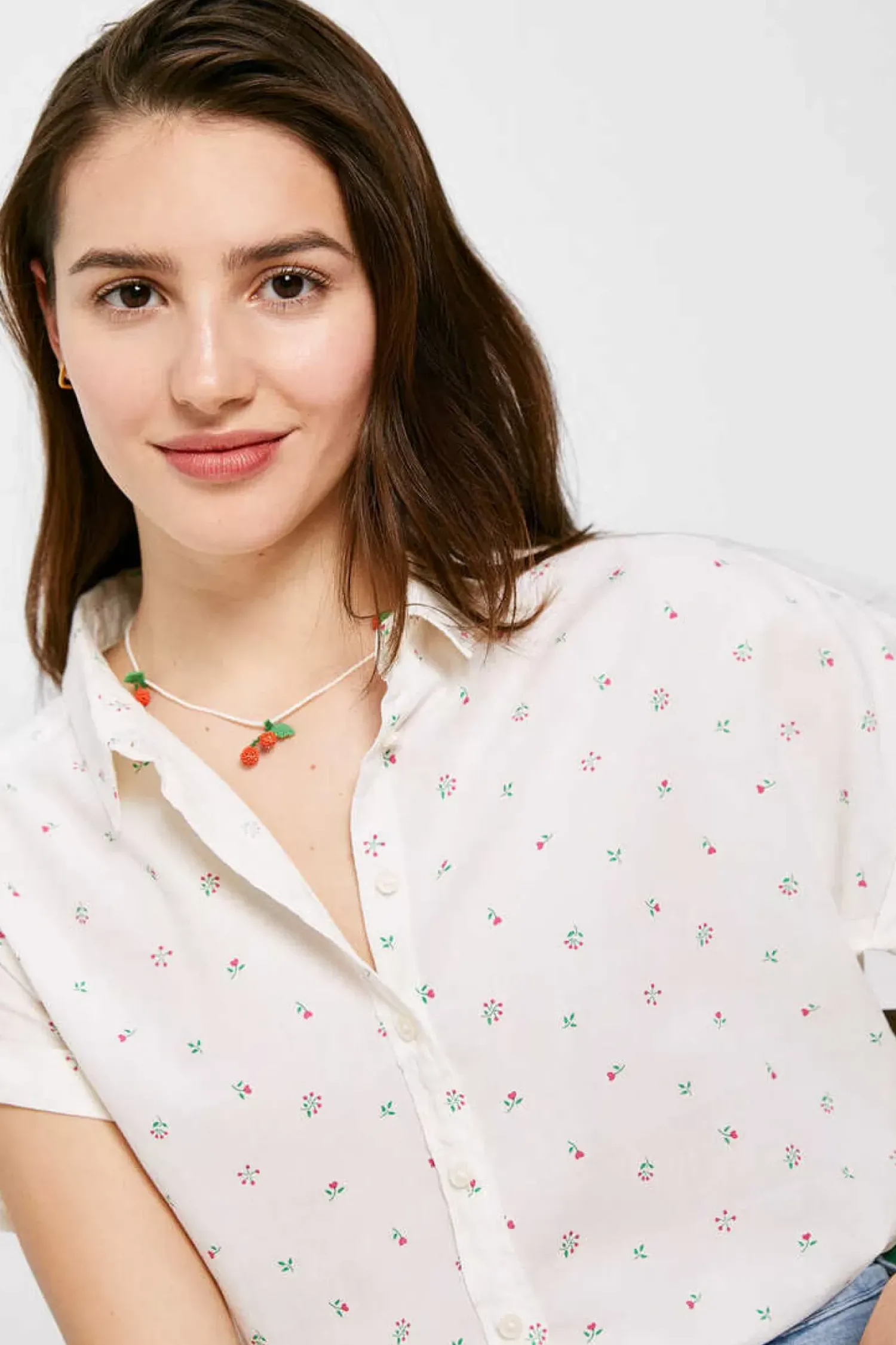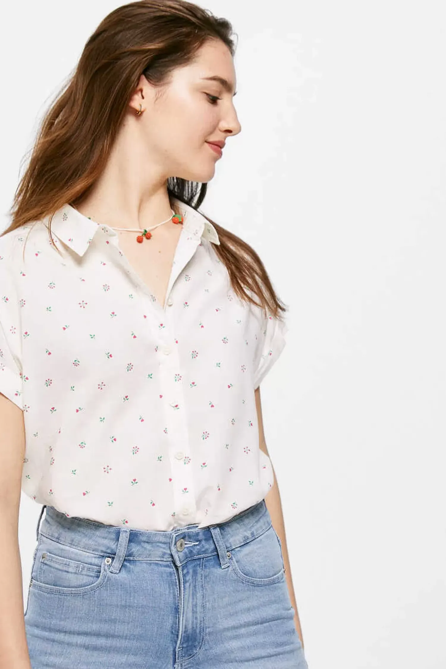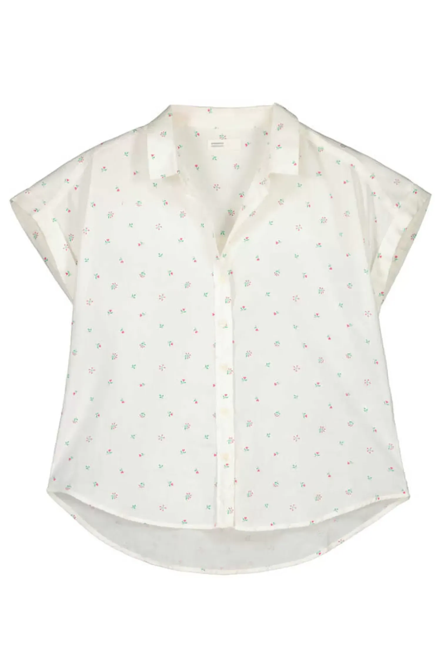 Blusa De Manga Curta Descaida Com Roda, Com Gola Camiseira, Com Botoes Na Frente E Estampado De Mini Flores.