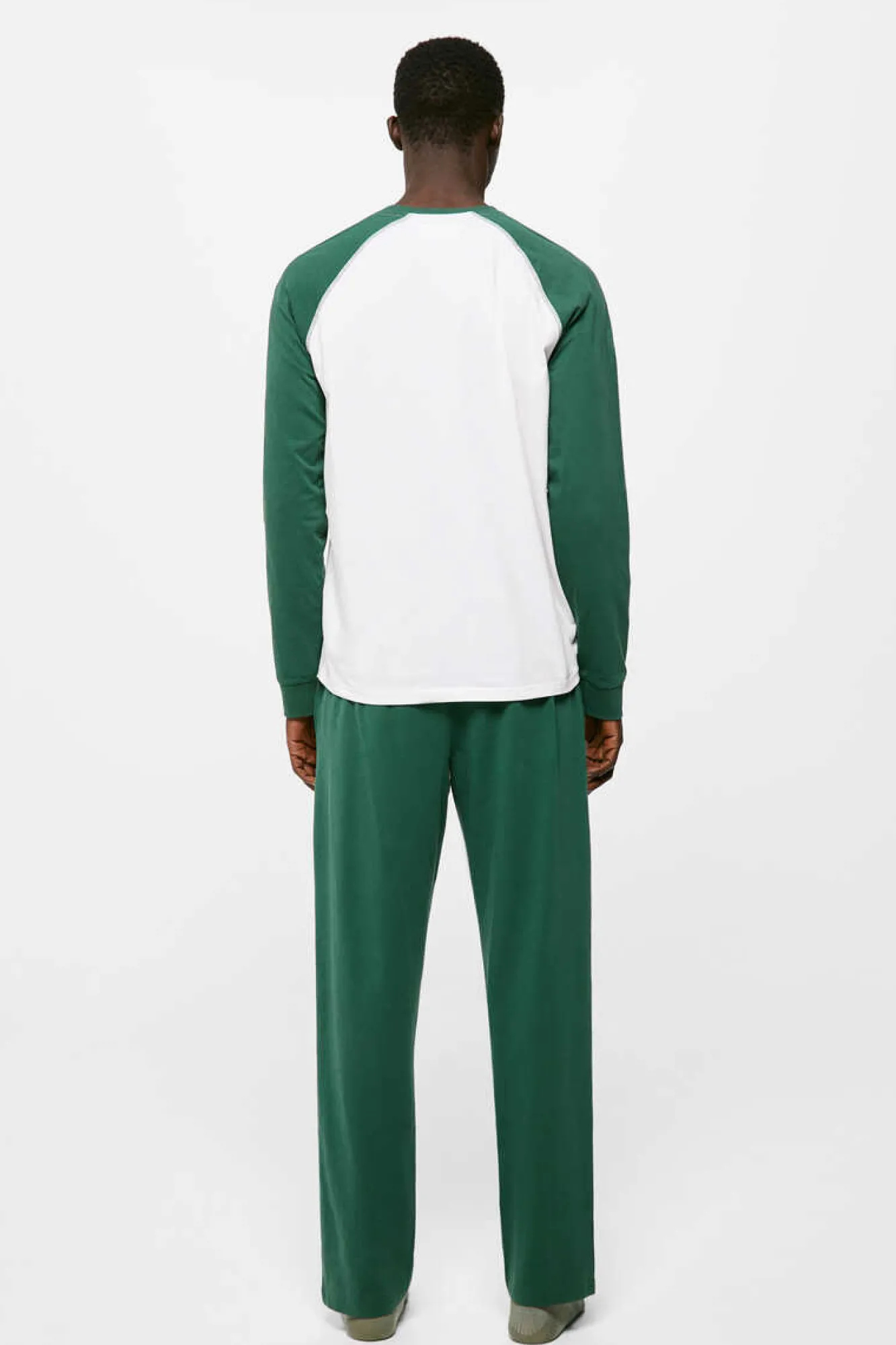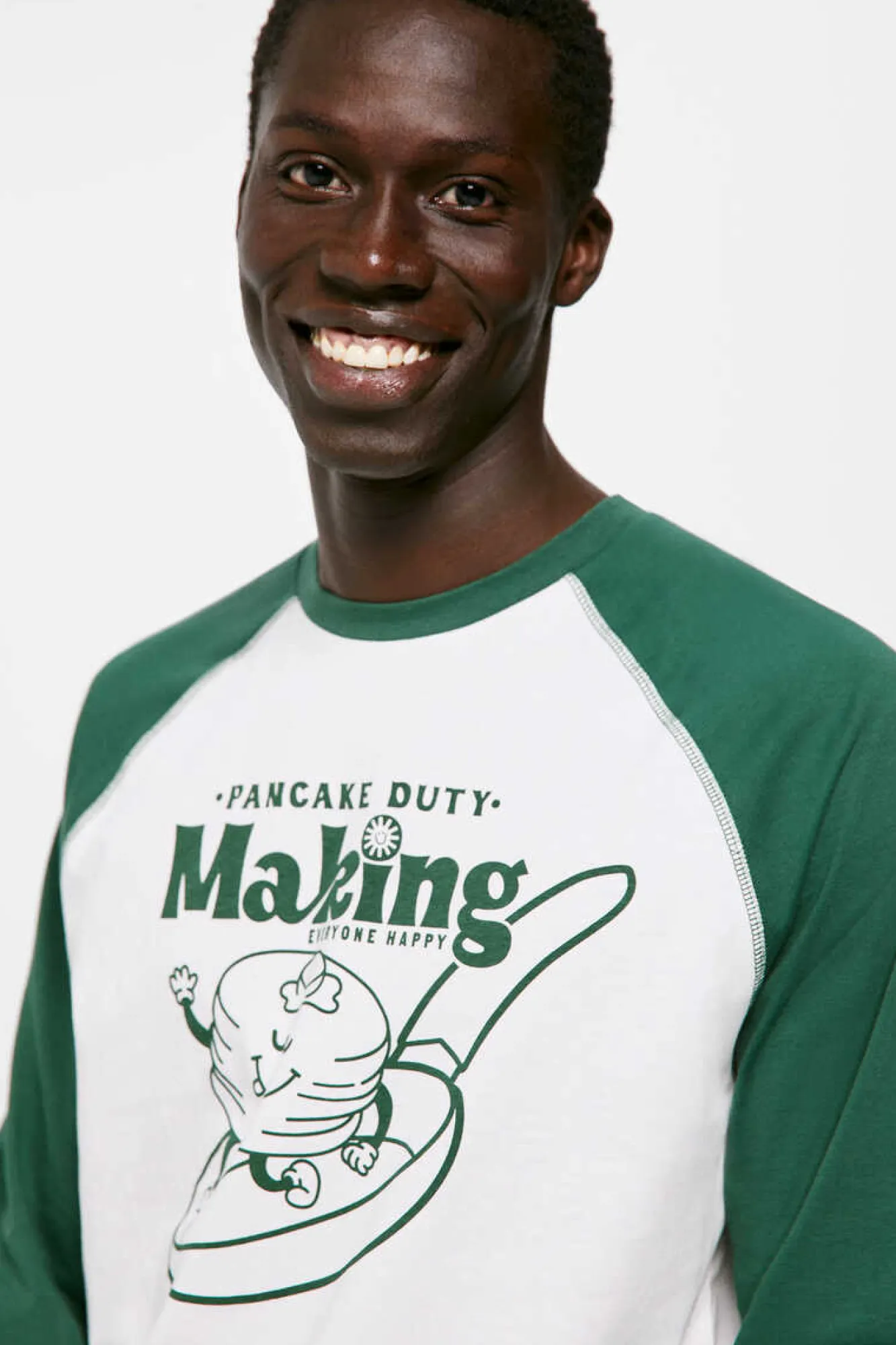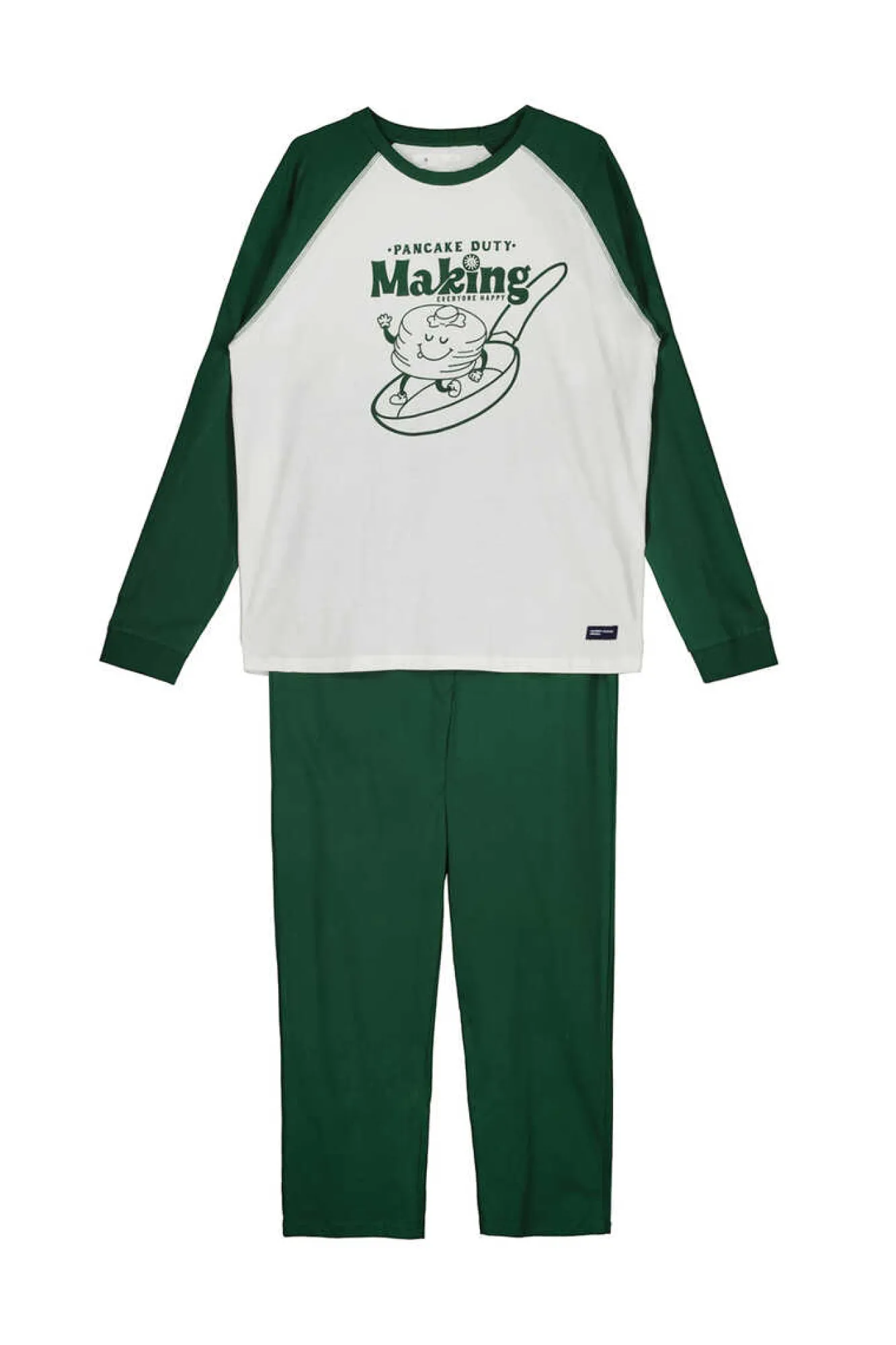 Pijama Comprido De Malha De Algodao. T-Shirt Manga Ragla Com Print De Pancake E Etiqueta Decorativa. Calcas Com Bolsos E Cintura Elastica Ajustavel Por Cordao. … Colecao Reconsider.Ver Mais