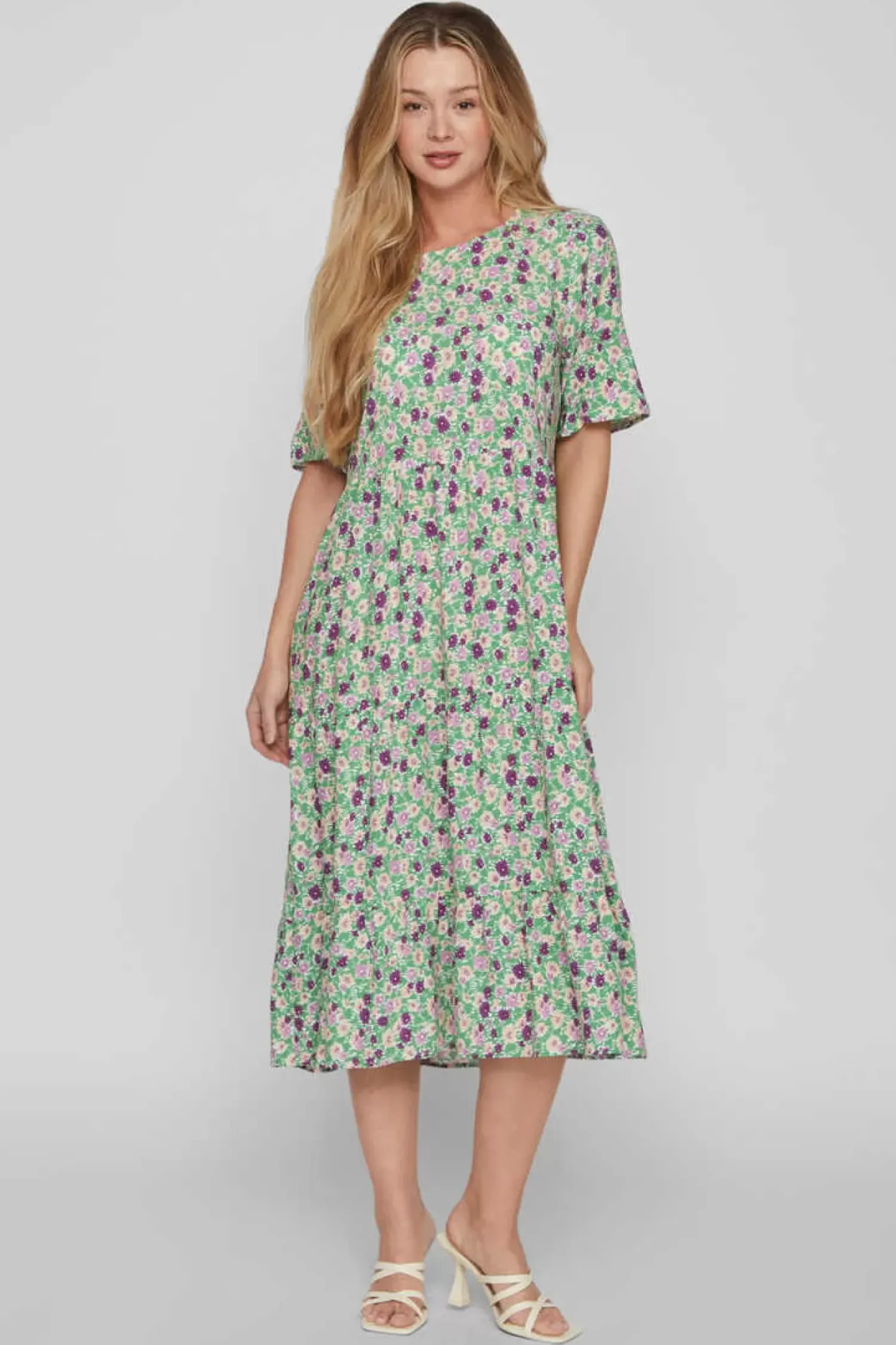 Vestido Midi De Manga Curta, Decote Redondo. Corte Folgado. Pequena Abertura Nas Costas Fechadas Mediante Botao.