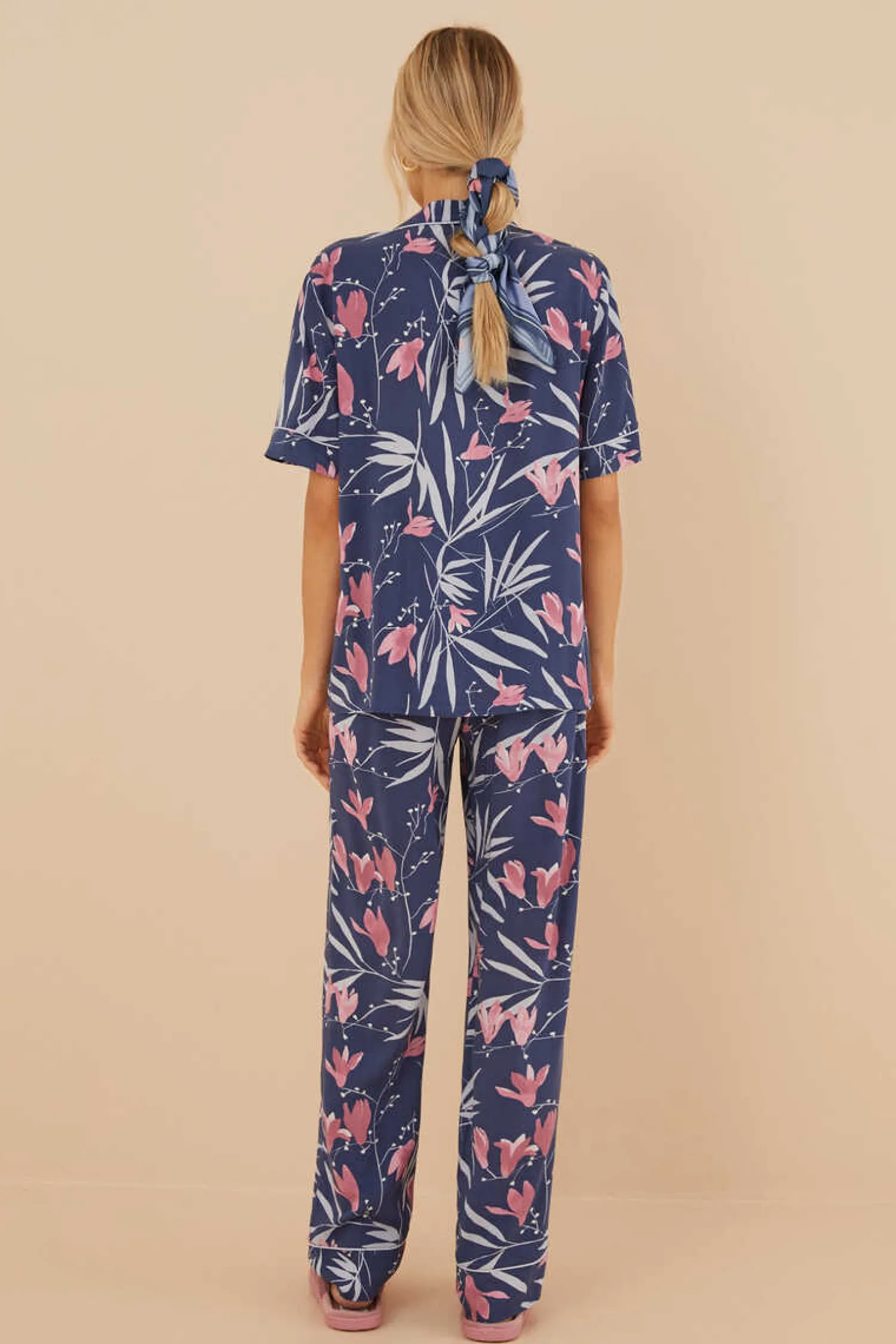 Pijama Camiseiro De Manga Curta E Calcas, Com Maravilhoso Estampado De Flores, Confecionado Em Suave Tecido De Viscose. Top Com Gola De Lapela Com Detalhe De De … Bruns, Bolso A Frente E Botoes De Nacar. Calcas Com Cos Elastico Ajustavel Com Fita Com Tons Em Contraste.