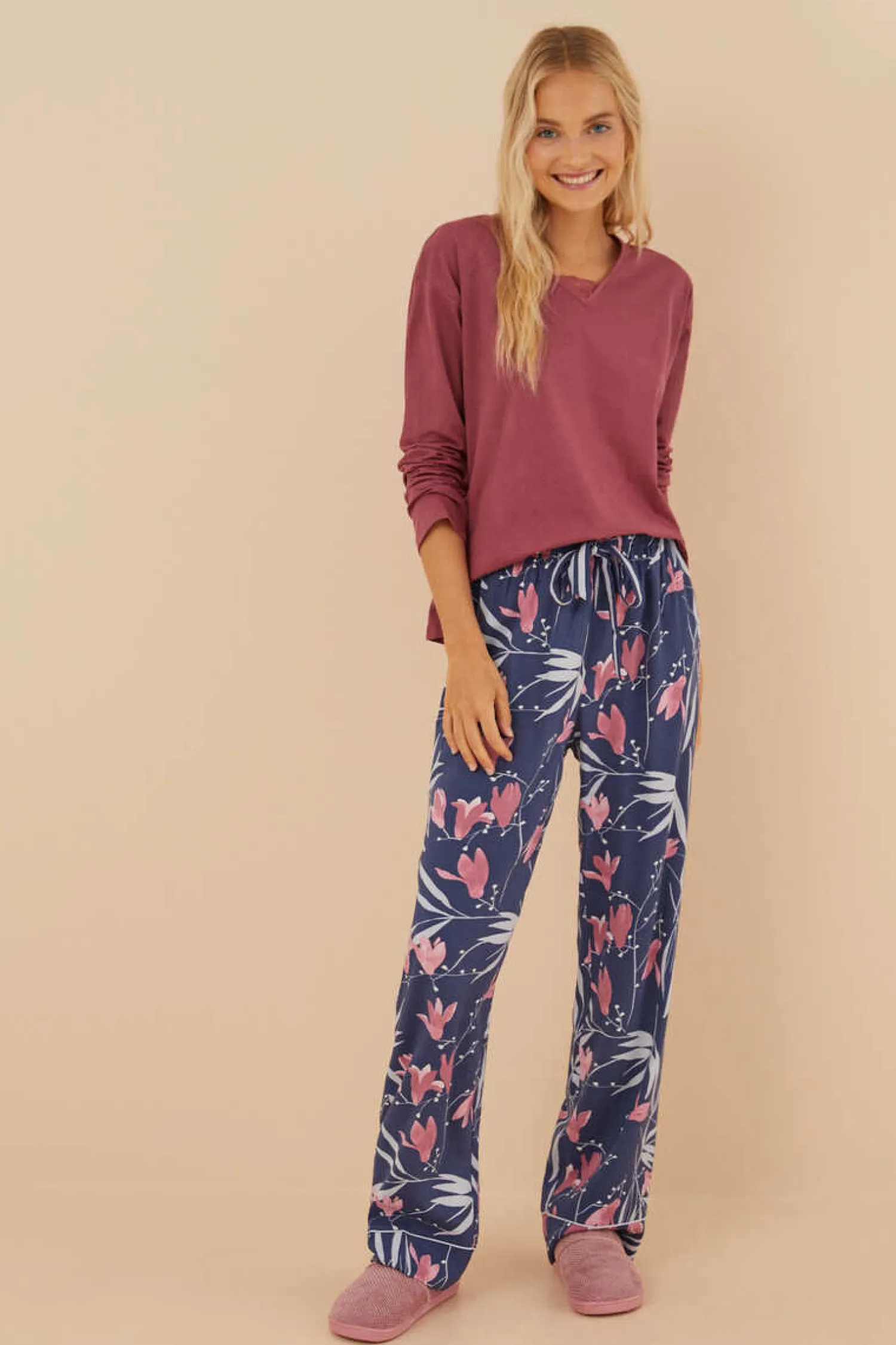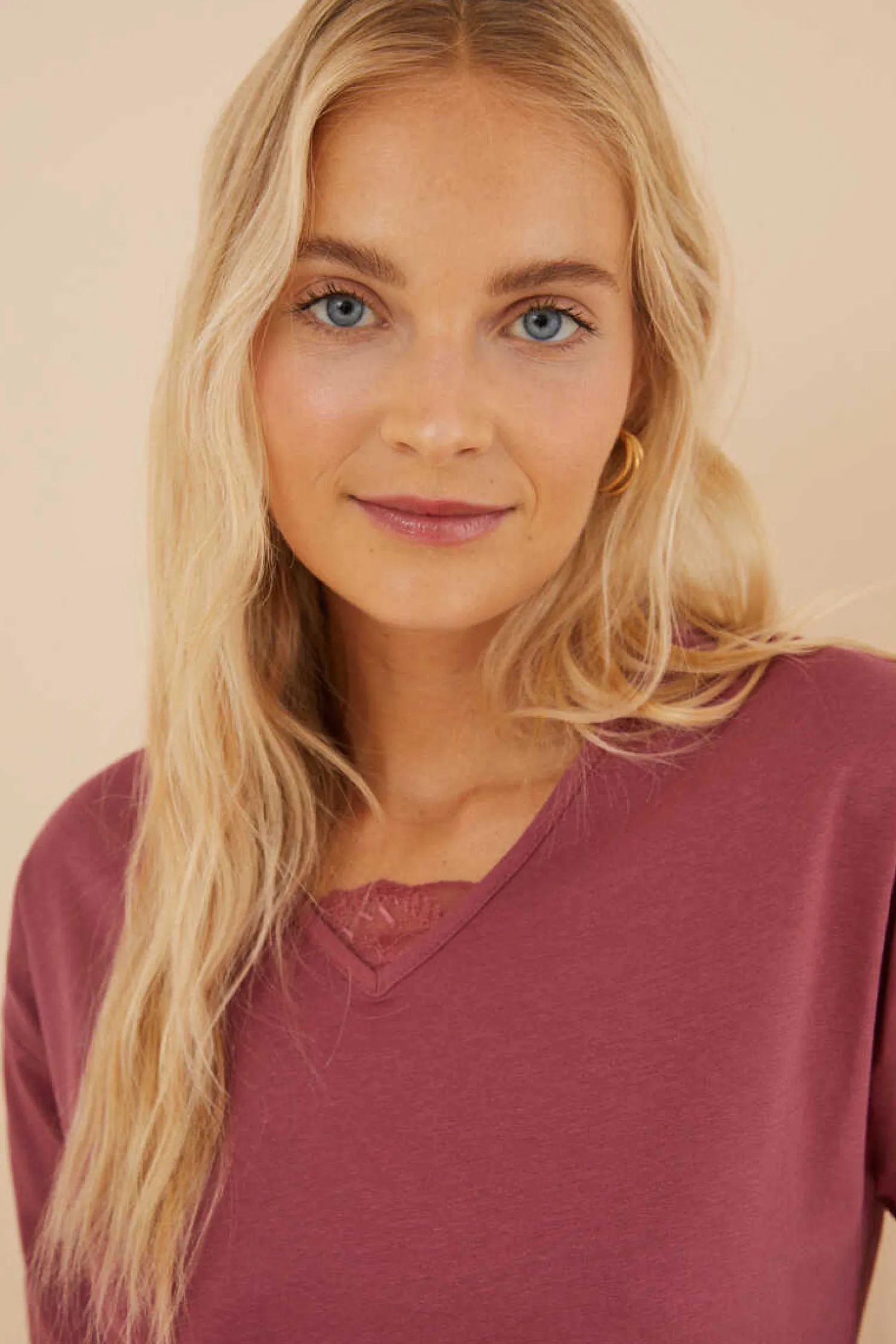 T-Shirt 100% Algodao De Manga Comprida, Em Grena, Com Decote Em Bico, Detalhe De Renda E Debrum De Cetim. Ombro Caido E Estampado Na Parte Interior Das Costas. … Combina Com Varias Calcas Diferentes, Escolhe O Teu Favorito E Personaliza O Teu Proprio Pijama.